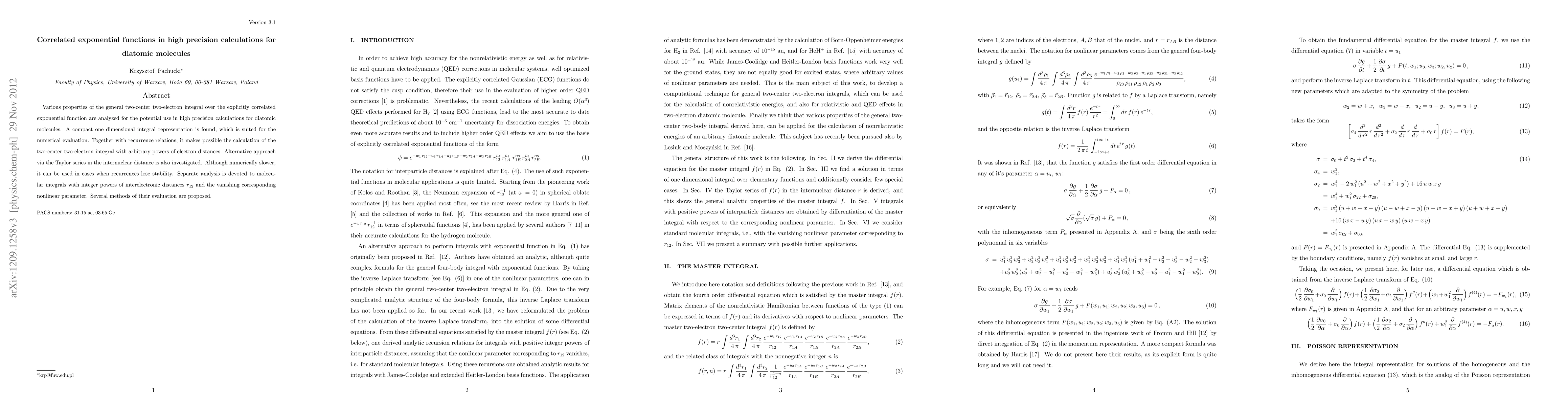 This paper analyzes two-center two-electron integrals involving correlated exponential functions for high precision calculations in diatomic molecules. It presents a compact one-dimensional integral representation and recurrence relations for efficient numerical evaluation, alongside a slower but stable Taylor series approach for cases where recurrences are unstable.