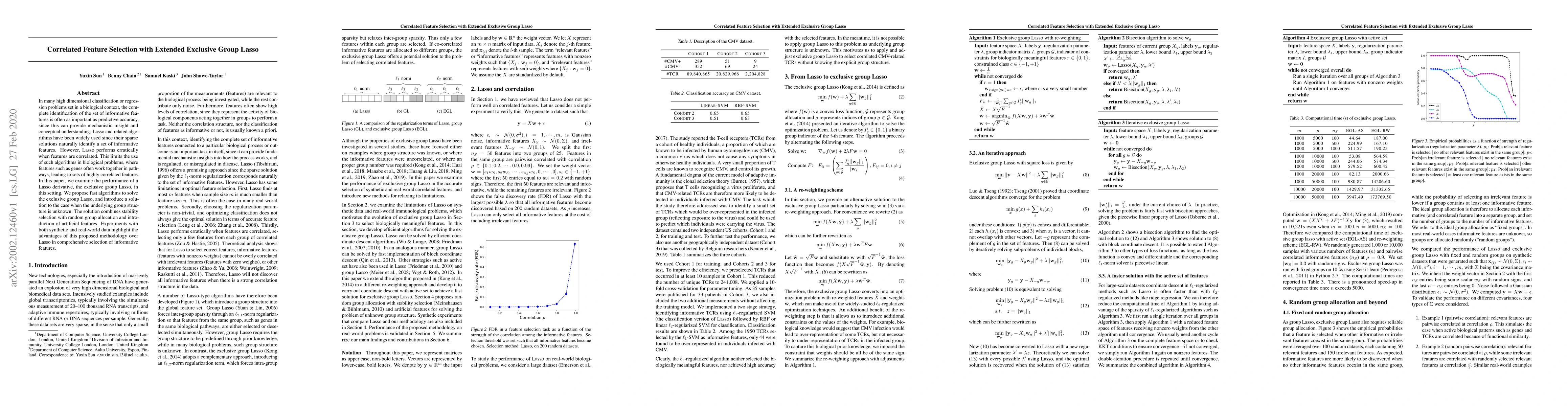 In many high dimensional classification or regression problems set in a biological context, the complete identification of the set of informative features is often as important as predictive accuracy, since this can provide mechanistic insight and conceptual understanding. Lasso and related algorithms have been widely used since their sparse solutions naturally identify a set of informative features. However, Lasso performs erratically when features are correlated. This limits the use of such algorithms in biological problems, where features such as genes often work together in pathways, leading to sets of highly correlated features. In this paper, we examine the performance of a Lasso derivative, the exclusive group Lasso, in this setting. We propose fast algorithms to solve the exclusive group Lasso, and introduce a solution to the case when the underlying group structure is unknown. The solution combines stability selection with random group allocation and introduction of artificial features. Experiments with both synthetic and real-world data highlight the advantages of this proposed methodology over Lasso in comprehensive selection of informative features.