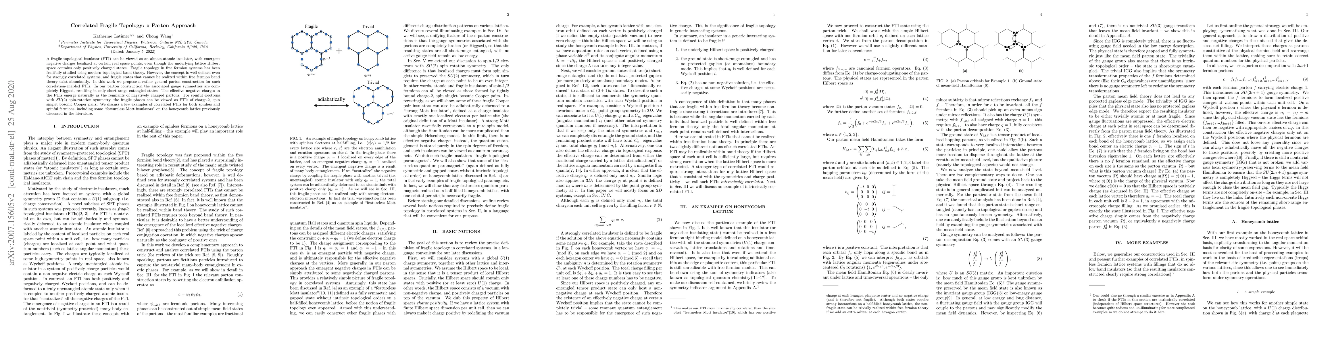 A fragile topological insulator (FTI) can be viewed as an almost-atomic insulator, with emergent negative charges localized at certain real space points, even though the underlying lattice Hilbert space contains only positively charged states. Fragile topology in free fermion systems has been fruitfully studied using modern topological band theory. However, the concept is well defined even for strongly correlated systems, and fragile states that cannot be realized within free fermion band theory exist abundantly. In this work we propose a rather general parton construction for such correlation-enabled FTIs. In our parton construction the associated gauge symmetries are completely Higgsed, resulting in only short-range entangled states. The effective negative charges in the FTIs emerge naturally as the remnants of negatively charged partons. For spinful electrons with $SU(2)$ spin-rotation symmetry, the fragile phases can be viewed as FTIs of charge-$2$, spin singlet bosonic Cooper pairs. We discuss a few examples of correlated FTIs for both spinless and spinful fermions, including some "featureless Mott insulators" on the honeycomb lattice previously discussed in the literature.