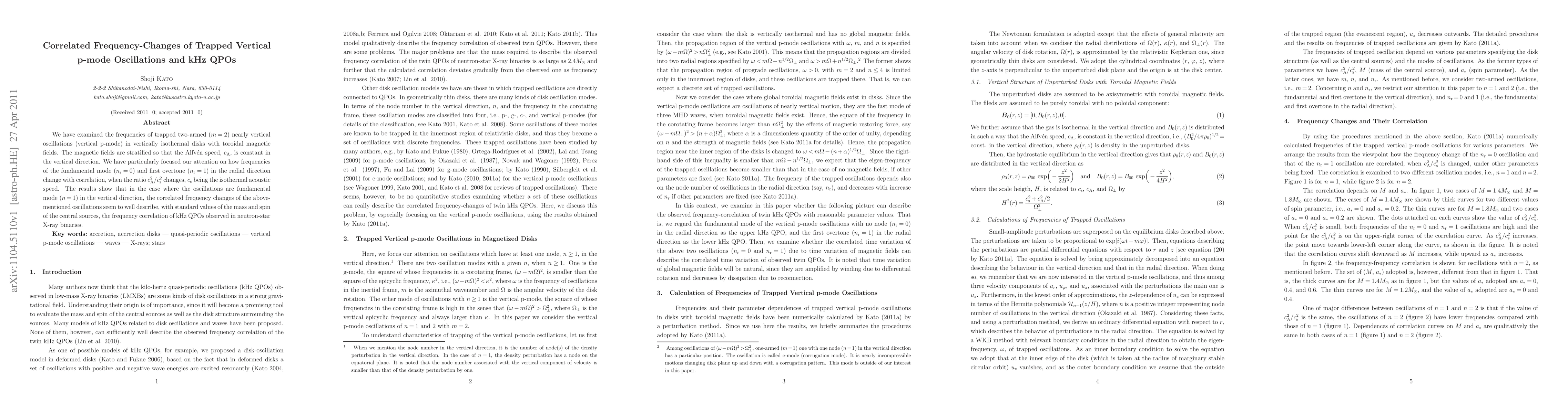 This study investigates the frequency changes of trapped vertical p-mode oscillations in magnetized disks, correlating these changes with kilohertz quasi-periodic oscillations (kHz QPOs) in neutron-star X-ray binaries. The results suggest that fundamental mode vertical oscillations can describe the observed frequency correlation of kHz QPOs.