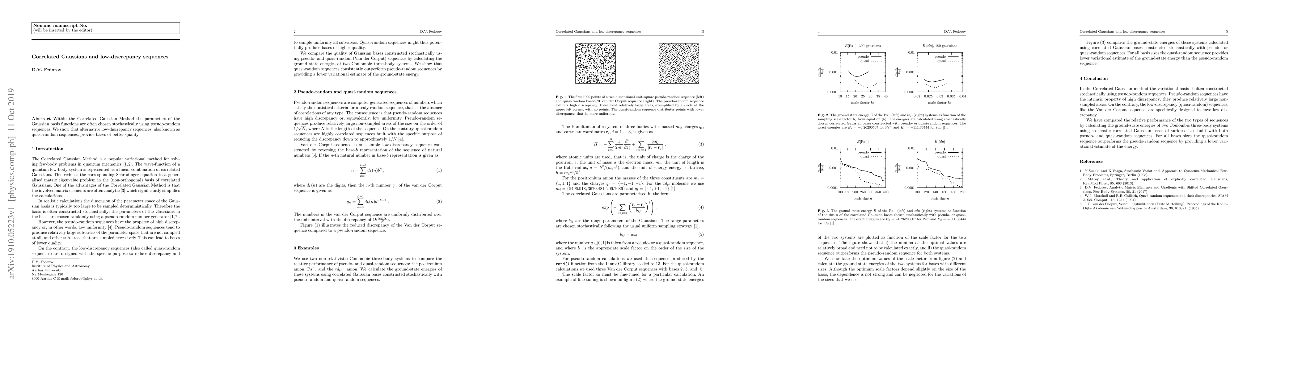 Summary: The Correlated Gaussian Method benefits from using low-discrepancy sequences instead of pseudo-random sequences to select Gaussian basis function parameters, resulting in higher-quality bases. This approach enhances the method's overall performance.