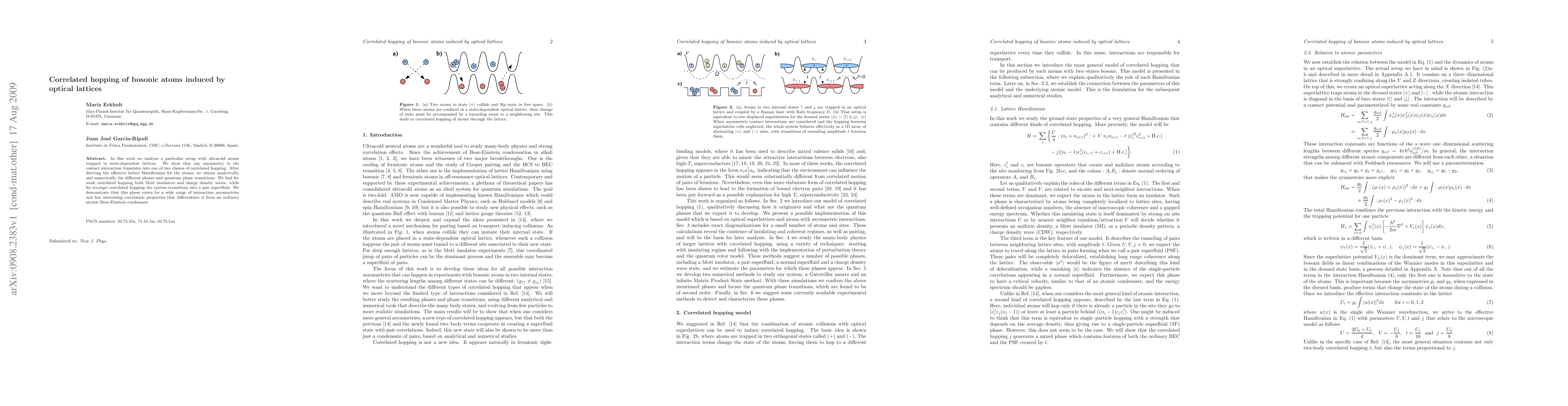 In this work we analyze a particular setup with ultracold atoms trapped in state-dependent lattices. We show that any asymmetry in the contact interaction translates into one of two classes of correlated hopping. After deriving the effective lattice Hamiltonian for the atoms, we obtain analytically and numerically the different phases and quantum phase transitions. We find for weak correlated hopping both Mott insulators and charge density waves, while for stronger correlated hopping the system transitions into a pair superfluid. We demonstrate that this phase exists for a wide range of interaction asymmetries and has interesting correlation properties that differentiate it from an ordinary atomic Bose-Einstein condensate.