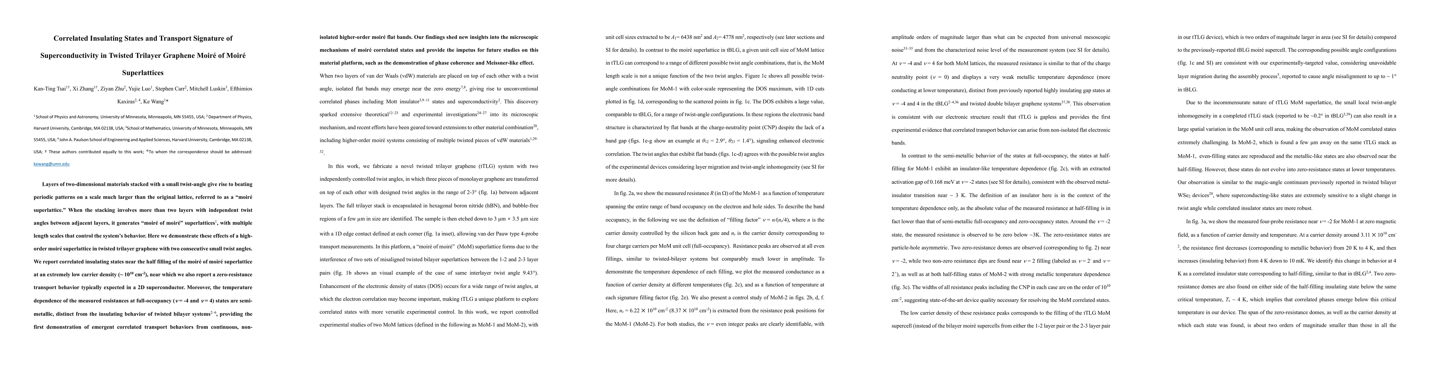This paper investigates the effects of moiré of moiré superlattices in twisted trilayer graphene, revealing correlated insulating states near half filling and zero-resistance transport behavior indicative of superconductivity at low carrier densities. The study highlights distinct semi-metallic temperature dependence at full occupancy states, offering new insights into the microscopic mechanisms of moiré correlated states.