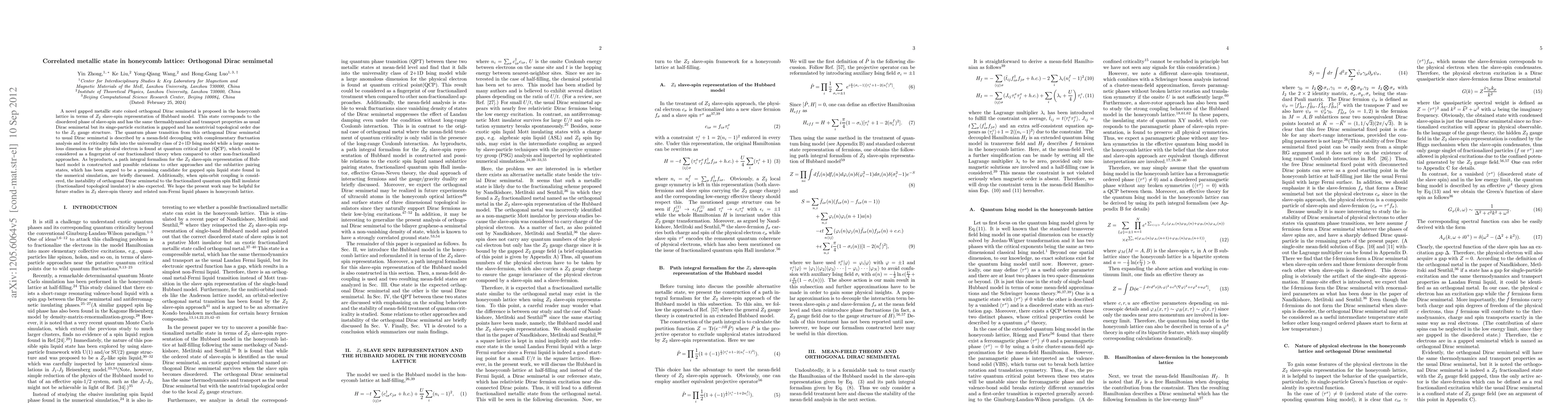 This paper proposes a novel gapped metallic state called orthogonal Dirac semimetal in honeycomb lattices, characterized by a $Z_{2}$ slave-spin representation of the Hubbard model. It discusses the quantum phase transition to usual Dirac semimetal and identifies a large anomalous dimension at the quantum critical point, suggesting a fingerprint of the fractionalized theory.