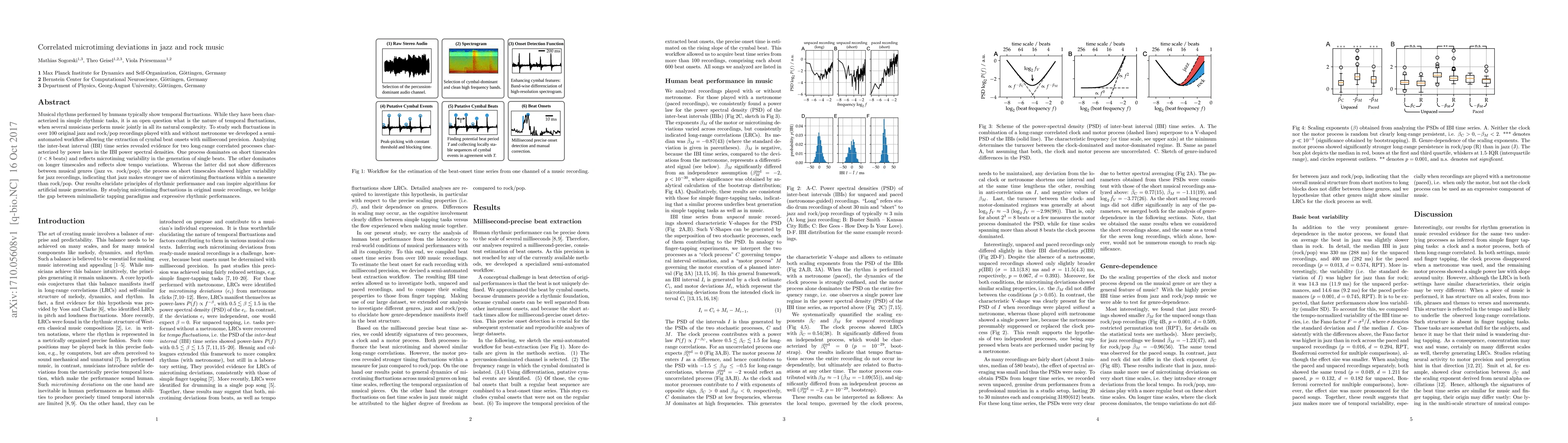 This study investigates temporal fluctuations in over 100 jazz and rock/pop recordings, revealing two long-range correlated processes in inter-beat intervals. Jazz exhibits higher microtiming variability compared to rock/pop, highlighting its expressive rhythmic complexity.