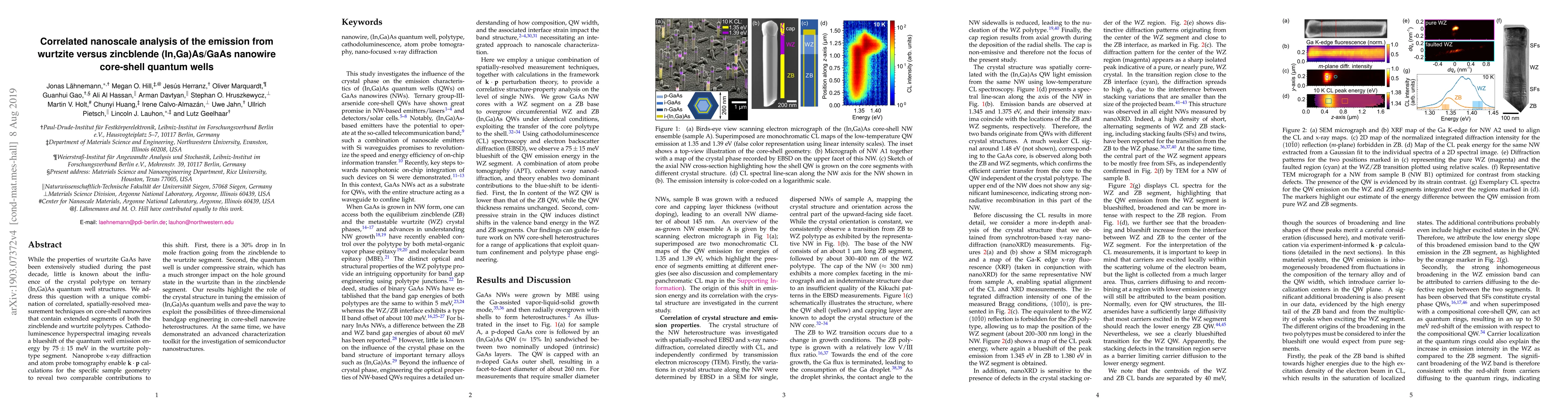 This research investigates the influence of crystal polytype on emission properties in (In,Ga)As/GaAs nanowire core-shell quantum wells, showing a 75±15 meV blueshift in wurtzite versus zincblende segments, attributed to a lower In mole fraction and compressive strain effects. Advanced characterization techniques reveal significant insights into three-dimensional bandgap engineering.