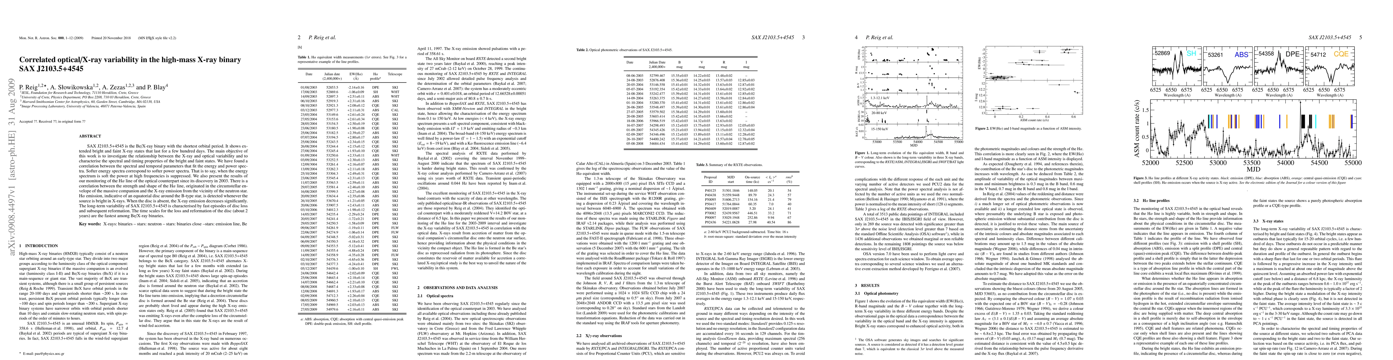 SAX J2103.5+4545 is the Be/X-ray binary with the shortest orbital period. It shows extended bright and faint X-ray states that last for a few hundred days. The main objective of this work is to investigate the relationship between the X-ray and optical variability and to characterise the spectral and timing properties of the bright and faint states. We have found a correlation between the spectral and temporal parameters that fit the energy and power spectra. Softer energy spectra correspond to softer power spectra. That is to say, when the energy spectrum is soft the power at high frequencies is suppressed. We also present the results of our monitoring of the Halpha line of the optical counterpart since its discovery in 2003. There is a correlation between the strength and shape of the Halpha line, originated in the circumstellar envelope of the massive companion and the X-ray emission from the vicinity of the neutron star. Halpha emission, indicative of an equatorial disc around the B-type star, is detected whenever the source is bright in X-rays. When the disc is absent, the X-ray emission decreases significantly. The long-term variability of SAX J2103.5+4545 is characterised by fast episodes of disc loss and subsequent reformation. The time scales for the loss and reformation of the disc (about 2 years) are the fastest among Be/X-ray binaries.