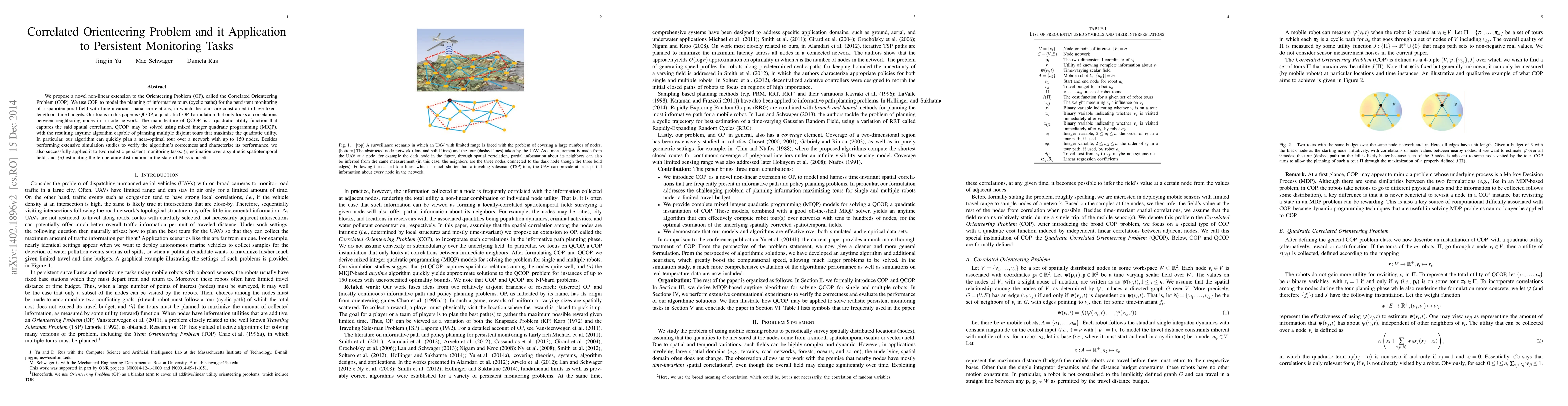 We propose a novel non-linear extension to the Orienteering Problem (OP), called the Correlated Orienteering Problem (COP). We use COP to model the planning of informative tours for the persistent monitoring of a spatiotemporal field with time-invariant spatial correlations, in which the tours are constrained to have limited length. Our focus in this paper is QCOP a quadratic COP formulation that only looks at correlations between neighboring nodes in a node network. The main feature of QCOP is a quadratic utility function capturing the said spatial correlation. QCOP may be solved using mixed integer quadratic programming (MIQP), with the resulting anytime algorithm capable of planning multiple disjoint tours that maximize the quadratic utility. In particular, our algorithm can quickly plan a near-optimal tour over a network with up to $150$ nodes. Besides performing extensive simulation studies to verify the algorithm's correctness and characterize its performance, we also successfully applied it to two realistic persistent monitoring tasks: (i) estimation over a synthetic spatiotemporal field, and (ii) estimating the temperature distribution in the state of Massachusetts.
