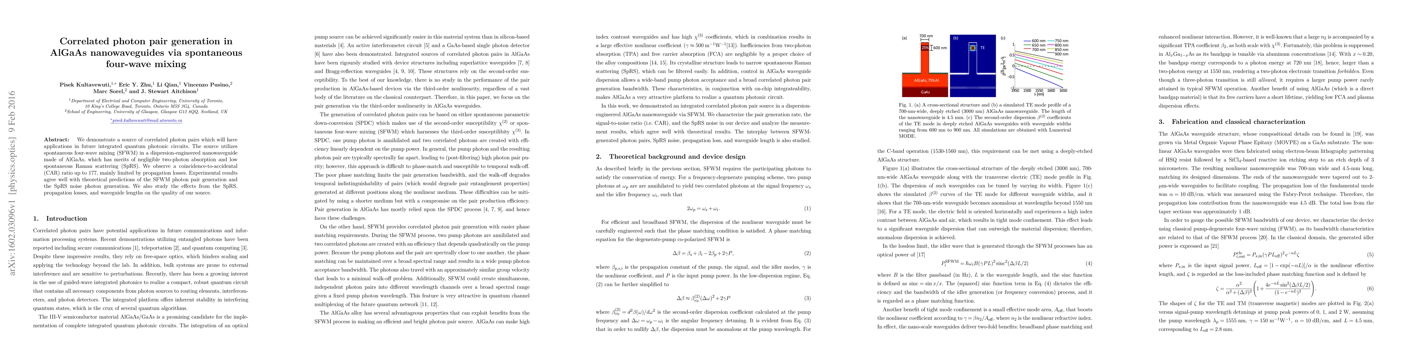 This research paper demonstrates a novel source of correlated photon pairs generated via spontaneous four-wave mixing in AlGaAs nanowaveguides, showing potential for future quantum photonic circuits. The study finds a high coincidence-to-accidental ratio of 177, limited primarily by propagation losses, and confirms theoretical predictions regarding the source's performance.