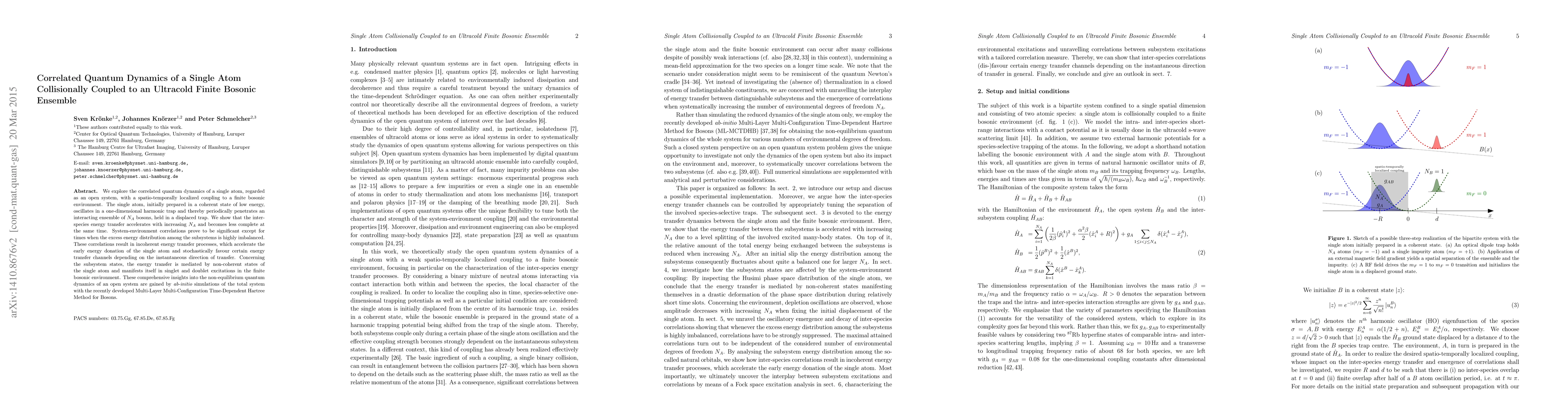 We explore the correlated quantum dynamics of a single atom, regarded as an open system, with a spatio-temporally localized coupling to a finite bosonic environment. The single atom, initially prepared in a coherent state of low energy, oscillates in a one-dimensional harmonic trap and thereby periodically penetrates an interacting ensemble of $N_A$ bosons, held in a displaced trap. We show that the inter-species energy transfer accelerates with increasing $N_A$ and becomes less complete at the same time. System-environment correlations prove to be significant except for times when the excess energy distribution among the subsystems is highly imbalanced. These correlations result in incoherent energy transfer processes, which accelerate the early energy donation of the single atom and stochastically favour certain energy transfer channels depending on the instantaneous direction of transfer. Concerning the subsystem states, the energy transfer is mediated by non-coherent states of the single atom and manifests itself in singlet and doublet excitations in the finite bosonic environment. These comprehensive insights into the non-equilibrium quantum dynamics of an open system are gained by ab-initio simulations of the total system with the recently developed Multi-Layer Multi-Configuration Time-Dependent Hartree Method for Bosons.