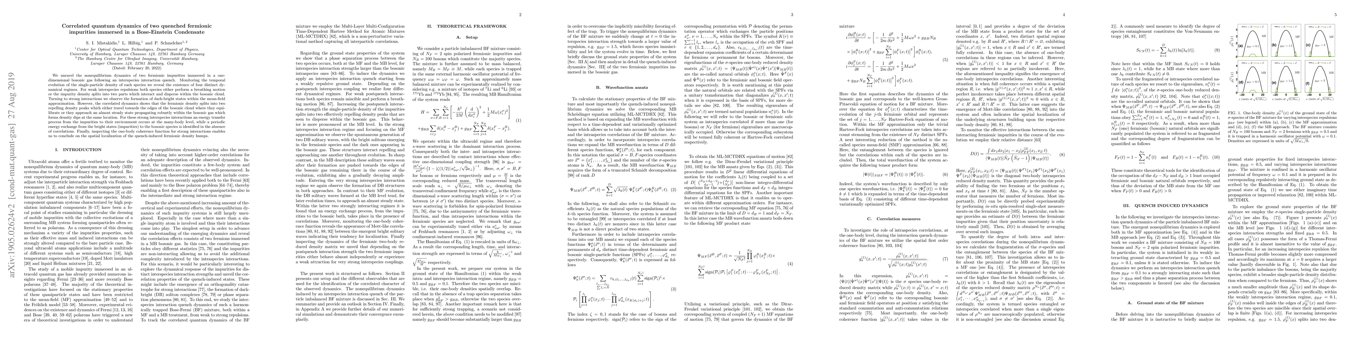 We unravel the nonequilibrium dynamics of two fermionic impurities immersed in a one-dimensional bosonic gas following an interspecies interaction quench from weak to strong repulsions. Monitoring the temporal evolution of the single-particle density of each species we reveal the existence of four distinct dynamical regimes. For weak interspecies repulsions both species either perform a breathing motion or the impurity density splits into two parts which interact and disperse within the bosonic cloud. Turning to strong interactions we observe the formation of dark-bright states within the mean-field approximation. However, the correlated dynamics shows that the fermionic density splits into two repelling density peaks which either travel towards the edges of the bosonic cloud where they equilibrate or they approach an almost steady state propagating robustly within the bosonic gas which forms density dips at the same location. For these strong interspecies interactions an energy transfer process from the impurities to their environment occurs at the many-body level, while a periodic energy exchange from the bright states (impurities) to the bosonic species is identified in the absence of correlations. Finally, inspecting the one-body coherence function for strong interactions enables us to conclude on the spatial localization of the quench-induced fermionic density humps.