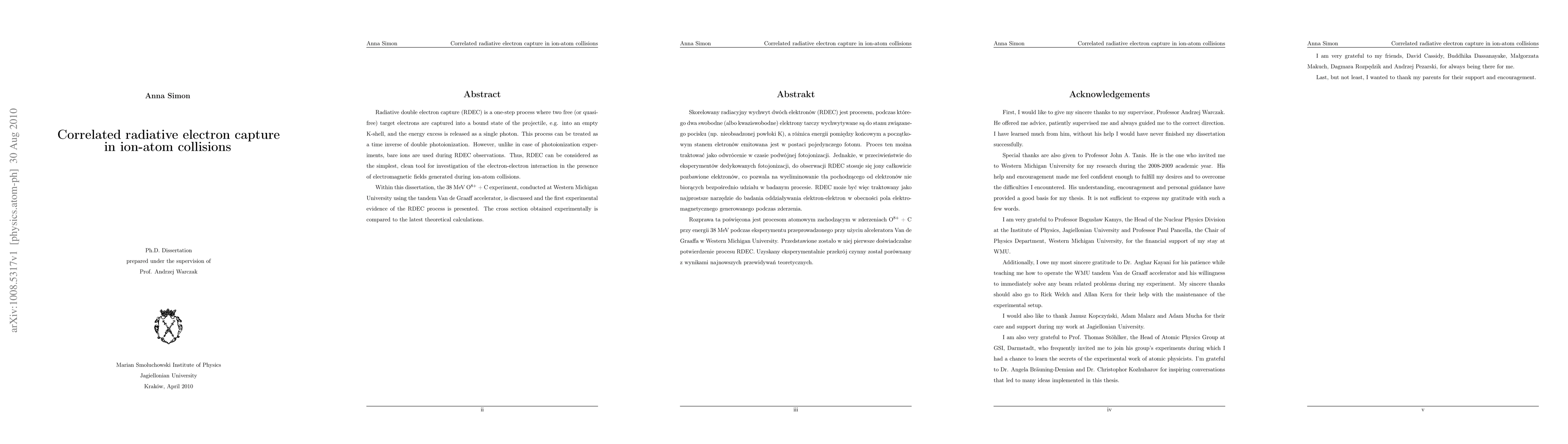 Radiative double electron capture (RDEC) is a one-step process where two free (or quasi-free) target electrons are captured into a bound state of the projectile, e.g. into an empty K-shell, and the energy excess is released as a single photon. This process can be treated as a time inverse of double photoionization. However, unlike in case of photoionization experiments, bare ions are used during RDEC observations. Thus, RDEC can be considered as the simplest, clean tool for investigation of the electron-electron interaction in the presence of electromagnetic fields generated during ion-atom collisions. Within this dissertation, the 38 MeV O(8+) + C experiment, conducted at Western Michigan University using the tandem Van de Graaff accelerator, is discussed and the first experimental evidence of the RDEC process is presented. The cross section obtained experimentally is compared to the latest theoretical calculations.
