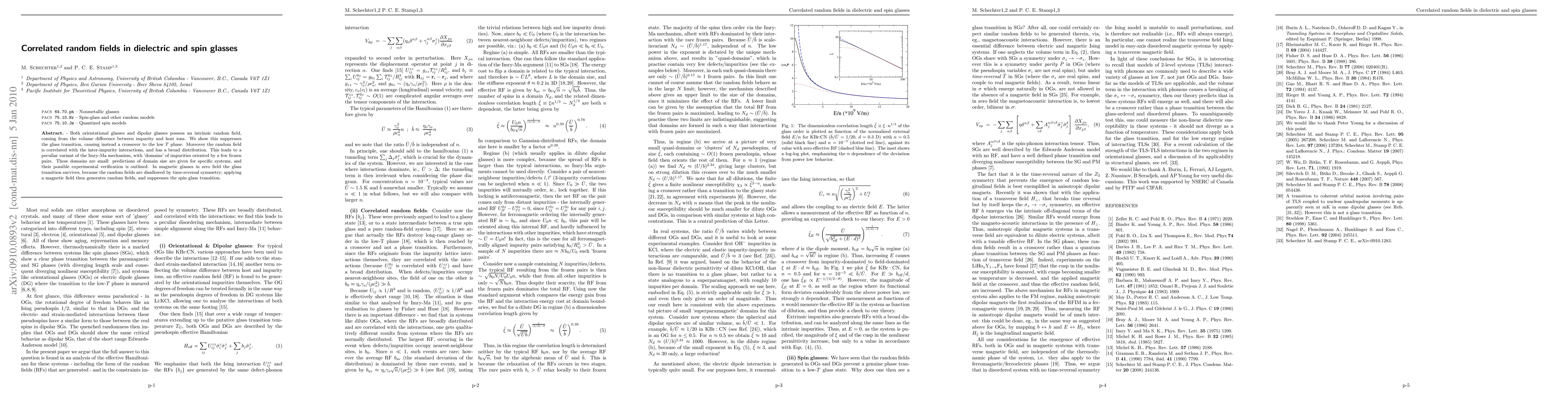 This paper investigates the effects of intrinsic random fields in dielectric and spin glasses, showing that these fields suppress the glass transition and lead to a crossover to a low-temperature phase. The study also reveals that these random fields are correlated with inter-impurity interactions, resulting in small 'domains' of oriented impurities, and discusses the implications for magnetic glasses under applied magnetic fields.