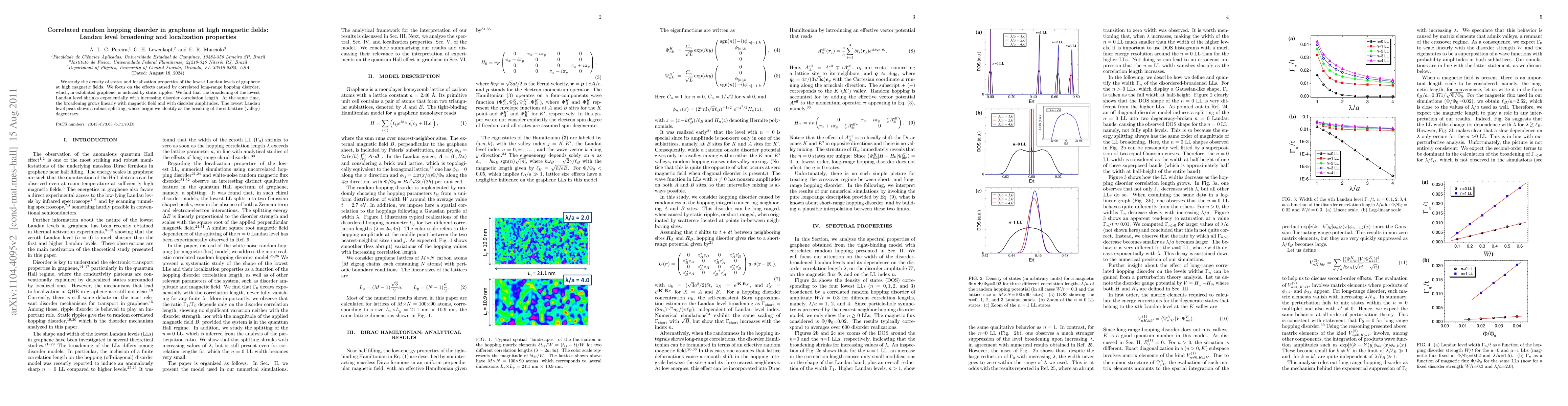 This paper investigates the density of states and localization of graphene's lowest Landau levels under high magnetic fields, focusing on correlated long-range hopping disorder due to static ripples. It reveals that Landau level broadening decreases exponentially with increasing disorder correlation length and increases linearly with magnetic field and disorder amplitude, while a robust splitting in the lowest Landau level is attributed to sublattice degeneracy breaking.