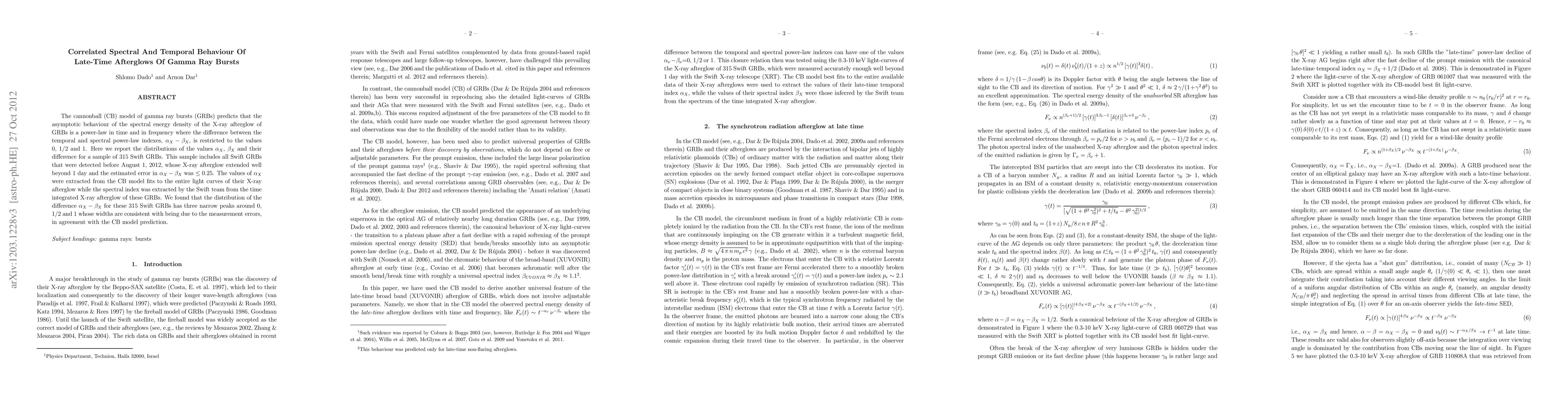 The cannonball (CB) model of gamma ray bursts (GRBs) predicts that the asymptotic behaviour of the spectral energy density of the X-ray afterglow of GRBs is a power-law in time and in frequency where the difference between the temporal and spectral power-law indexes, $\alpha_X-\beta_X$, is restricted to the values 0, 1/2 and 1. Here we report the distributions of the values $\alpha_X$, $\beta_X$ and their difference for a sample of 315 Swift GRBs. This sample includes all Swift GRBs that were detected before August 1, 2012, whose X-ray afterglow extended well beyond 1 day and the estimated error in $\alpha_X-\beta_X$ was $\leq 0.25$. The values of $\alpha_X$ were extracted from the CB model fits to the entire light curves of their X-ray afterglow while the spectral index was extracted by the Swift team from the time integrated X-ray afterglow of these GRBs. We found that the distribution of the difference $\alpha_X-\beta_X$ for these 315 Swift GRBs has three narrow peaks around 0, 1/2 and 1 whose widths are consistent with being due to the measurement errors, in agreement with the CB model prediction.