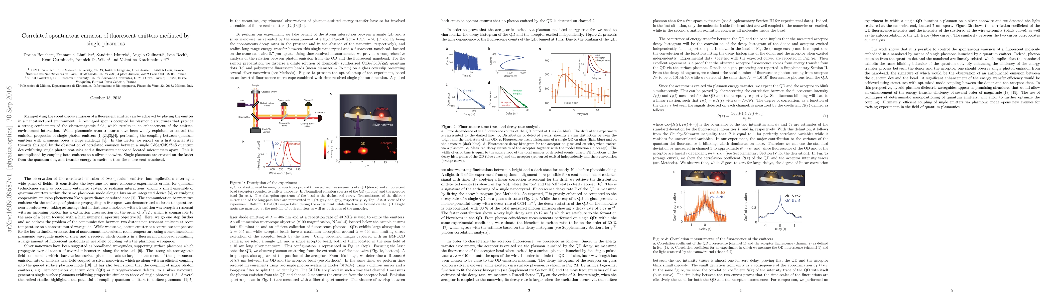 Manipulating the spontaneous emission of a fluorescent emitter can be achieved by placing the emitter in a nanostructured environment. A privileged spot is occupied by plasmonic structures that provide a strong confinement of the electromagnetic field, which results in an enhancement of the emitter-environment interaction. While plasmonic nanostructures have been widely exploited to control the emission properties of single photon emitters, performing the coupling between quantum emitters with plasmons poses a huge challenge. In this Letter we report on a first crucial step towards this goal by the observation of correlated emission between a single CdSe/CdS/ZnS quantum dot exhibiting single photon statistics and a fluorescent nanobead located micrometers apart. This is accomplished by coupling both emitters to a silver nanowire. Single-plasmons are created on the latter from the quantum dot, and transfer energy to excite in turn the fluorescent nanobead.