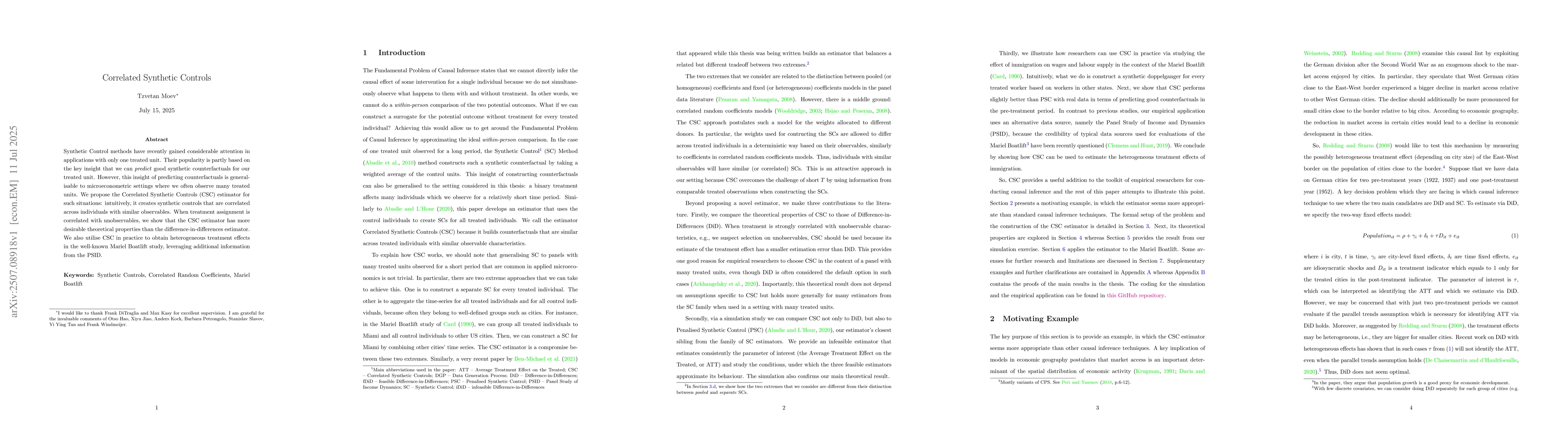 The paper introduces the CSC estimator, which creates correlated synthetic controls across treated individuals with similar observables, offering theoretical advantages over difference-in-differences in settings with correlated treatment assignment and unobservables.