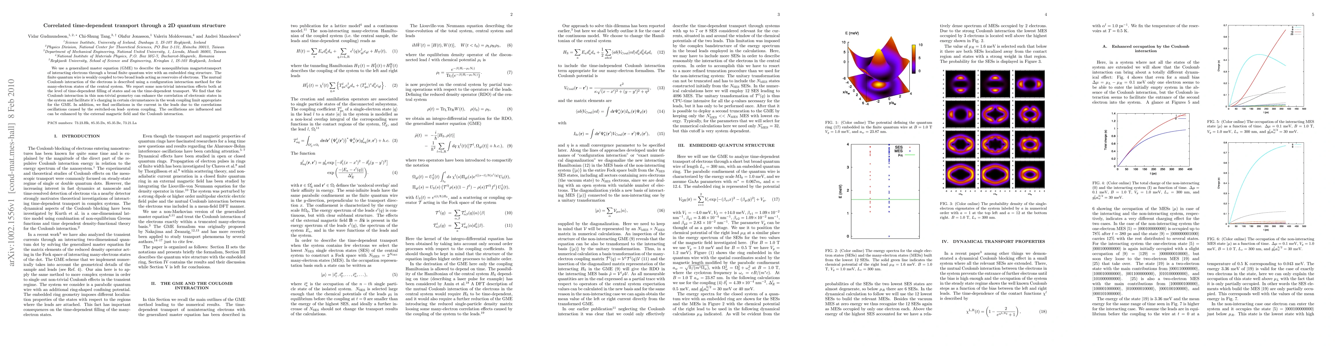 We use a generalized master equation (GME) to describe the nonequilibrium magnetotransport of interacting electrons through a broad finite quantum wire with an embedded ring structure. The finite quantum wire is weakly coupled to two broad leads acting as reservoirs of electrons. The mutual Coulomb interaction of the electrons is described using a configuration interaction method for the many-electron states of the central system. We report some non-trivial interaction effects both at the level of time-dependent filling of states and on the time-dependent transport. We find that the Coulomb interaction in this non-trivial geometry can enhance the correlation of electronic states in the system and facilitate it's charging in certain circumstances in the weak coupling limit appropriate for the GME. In addition, we find oscillations in the current in the leads due to the correlations oscillations caused by the switched-on lead- system coupling. The oscillations are influenced and can be enhanced by the external magnetic field and the Coulomb interaction.