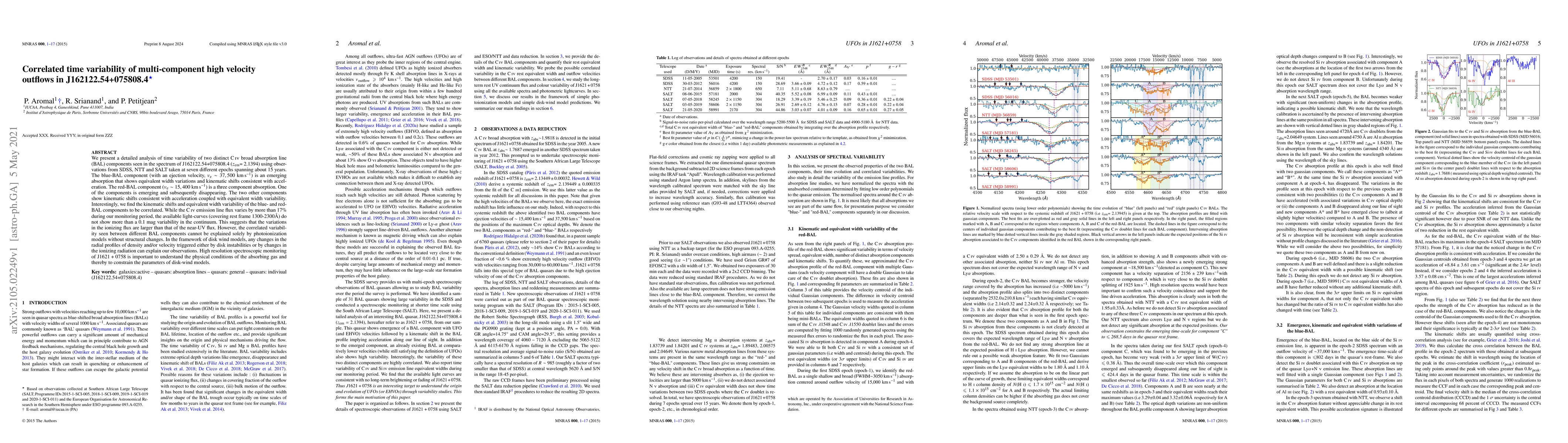 We present a detailed analysis of time variability of two distinct C IV broad absorption line (BAL) components seen in the spectrum of J162122.54+075808.4 ($z_{em}$ = 2.1394) using observations from SDSS, NTT and SALT taken at seven different epochs spanning about 15 years. The blue-BAL component (with an ejection velocity, $v_{\rm e}\sim37,500$ kms$^{-1}$) is an emerging absorption that shows equivalent width variations and kinematic shifts consistent with acceleration. The red-BAL component ($v_{\rm e} \sim 15,400$ kms$^{-1}$) is a three component absorption. One of the components is emerging and subsequently disappearing. The two other components show kinematic shifts consistent with acceleration coupled with equivalent width variability. Interestingly, we find the kinematic shifts and equivalent width variability of the blue- and red-BAL components to be correlated. While the C IV emission line flux varies by more than 17% during our monitoring period, the available light-curves (covering rest frame 1300-2300 angstrom do not show more than a 0.1 mag variability in the continuum. This suggests that the variations in the ionizing flux are larger than that of the near-UV flux. However, the correlated variability seen between different BAL components cannot be explained solely by photoionization models without structural changes. In the framework of disk wind models, any changes in the radial profiles of density and/or velocity triggered either by disk instabilities or by changes in the ionizing radiation can explain our observations. High resolution spectroscopic monitoring of J1621+0758 is important to understand the physical conditions of the absorbing gas and thereby to constrain the parameters of disk-wind models.