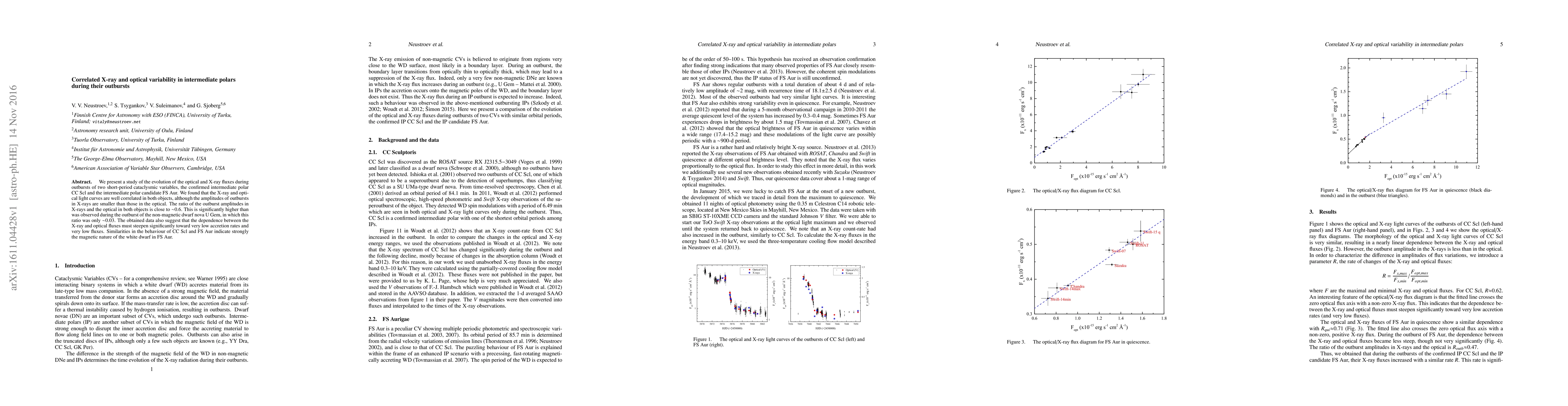 We present a study of the evolution of the optical and X-ray fluxes during outbursts of two short-period cataclysmic variables, the confirmed intermediate polar CC Scl and the intermediate polar candidate FS Aur. We found that the X-ray and optical light curves are well correlated in both objects, although the amplitudes of outbursts in X-rays are smaller than those in the optical. The ratio of the outburst amplitudes in X-rays and the optical in both objects is close to ~0.6. This is significantly higher than was observed during the outburst of the non-magnetic dwarf nova U Gem, in which this ratio was only ~0.03. The obtained data also suggest that the dependence between the X-ray and optical fluxes must steepen significantly toward very low accretion rates and very low fluxes. Similarities in the behaviour of CC Scl and FS Aur indicate strongly the magnetic nature of the white dwarf in FS Aur.