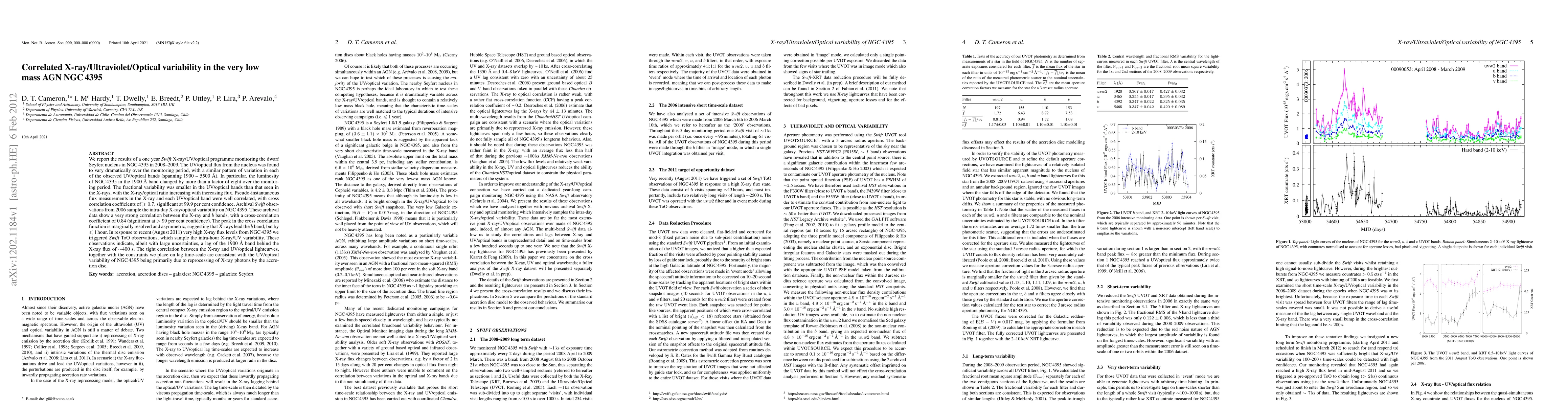 The study monitored the dwarf Seyfert galaxy NGC 4395 using Swift satellite, revealing dramatic UV/optical flux variations over a year. X-ray/optical ratio increased with higher flux, and UV/optical bands showed smaller variability than X-rays. Cross-correlation analysis indicated strong correlation between X-ray and optical/UV bands, suggesting UV/optical variability is primarily due to X-ray reprocessing by the accretion disc.