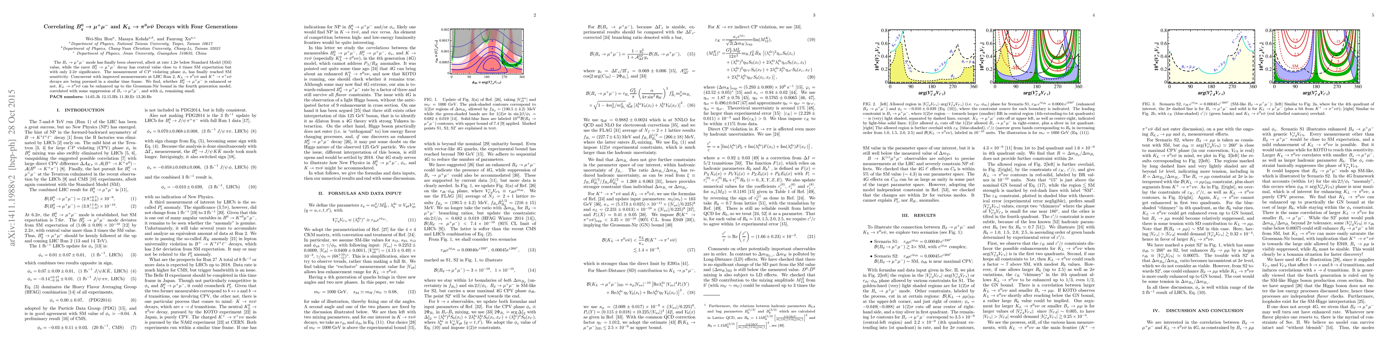 The paper explores correlations between New Physics (NP) effects in four decay modes: $B_q^0 \to \mu^+\mu^-$ and $K_L \to \pi^0\nu\bar\nu$, using the fourth generation model as an example. It examines the potential enhancements in both $B_d^0 \to \mu^+\mu^-$ and $K_L \to \pi^0\nu\bar\nu$ within this model, while considering constraints from other observables like $B_s \to \mu^+\mu^-$ and $\phi_s$.
