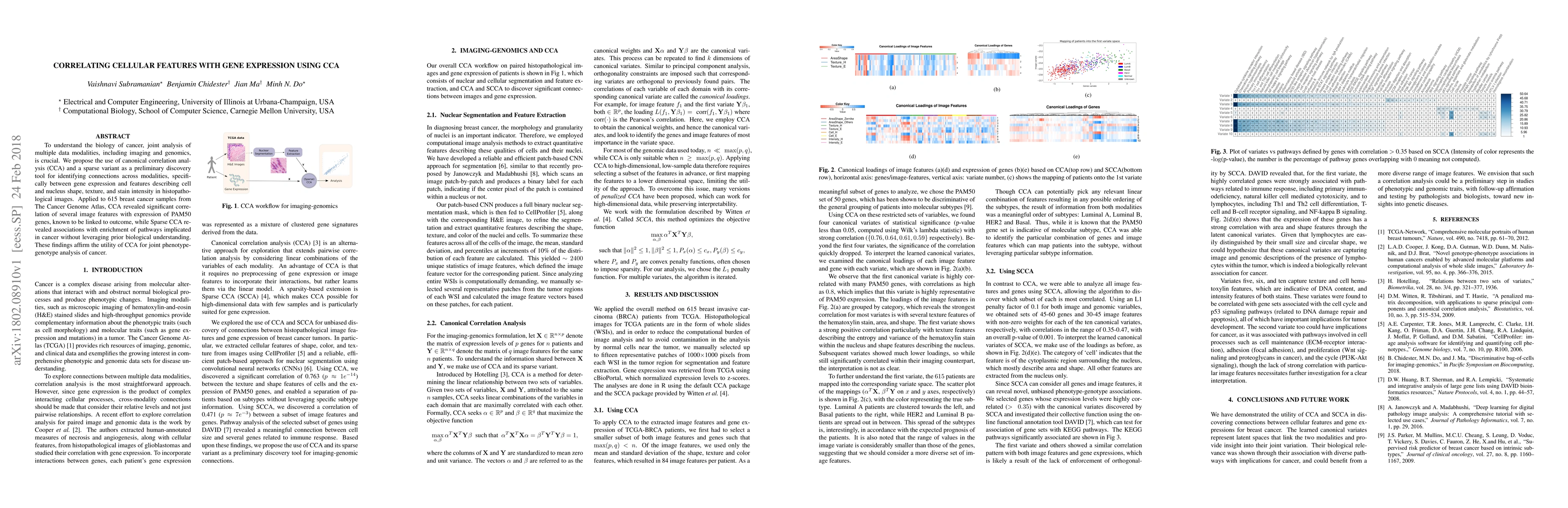 To understand the biology of cancer, joint analysis of multiple data modalities, including imaging and genomics, is crucial. The involved nature of gene-microenvironment interactions necessitates the use of algorithms which treat both data types equally. We propose the use of canonical correlation analysis (CCA) and a sparse variant as a preliminary discovery tool for identifying connections across modalities, specifically between gene expression and features describing cell and nucleus shape, texture, and stain intensity in histopathological images. Applied to 615 breast cancer samples from The Cancer Genome Atlas, CCA revealed significant correlation of several image features with expression of PAM50 genes, known to be linked to outcome, while Sparse CCA revealed associations with enrichment of pathways implicated in cancer without leveraging prior biological understanding. These findings affirm the utility of CCA for joint phenotype-genotype analysis of cancer.