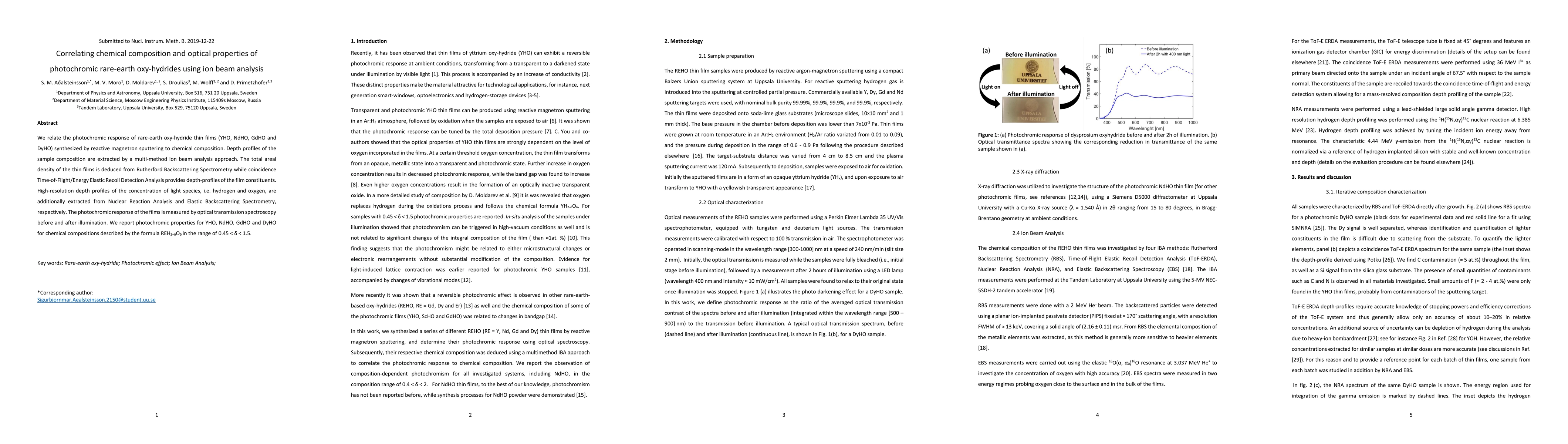 This study correlates the photochromic response of rare-earth oxy-hydride thin films to their chemical composition using ion beam analysis techniques. The research reveals the photochromic properties of YHO, NdHO, GdHO, and DyHO thin films synthesized by reactive magnetron sputtering, with compositional depth profiles determined by various ion beam analysis methods.