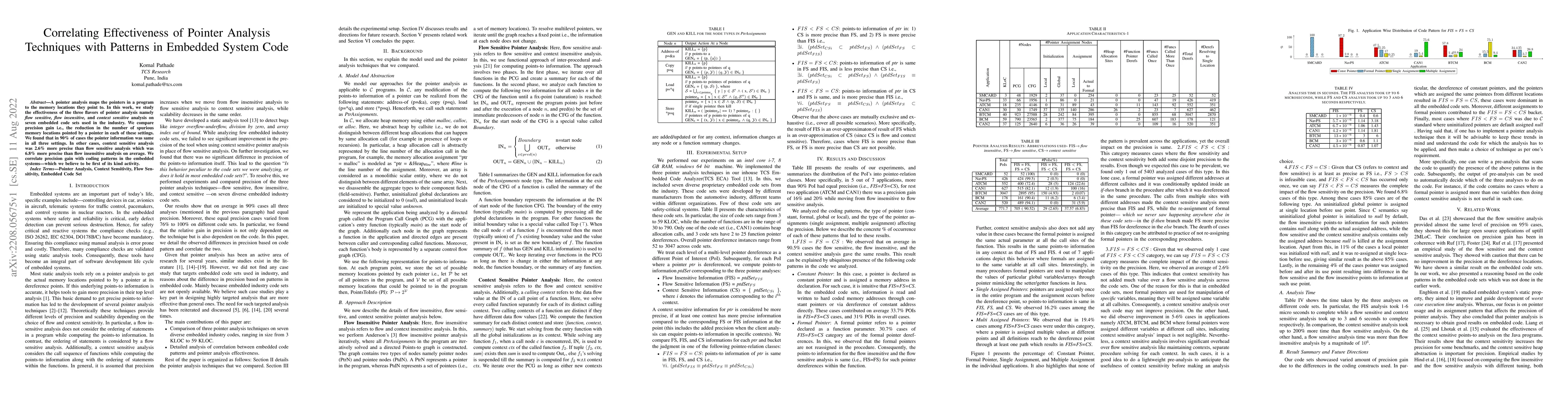 This study evaluates the effectiveness of three pointer analysis techniques—flow sensitive, flow insensitive, and context sensitive—on seven industry embedded code sets, finding that context sensitive analysis offers a modest 2.6% precision advantage over flow sensitive, which in turn is 6.8% more precise than flow insensitive. The research also correlates precision gains with specific coding patterns in embedded systems.
