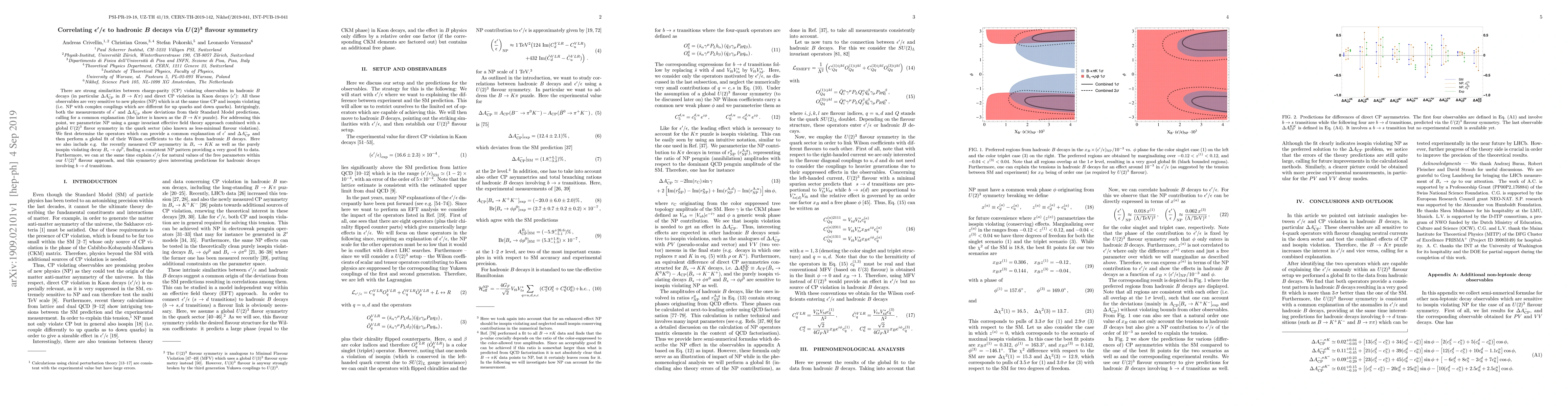 There are strong similarities between charge-parity (CP) violating observables in hadronic $B$ decays (in particular $\Delta A^-_{\rm CP}$ in $B\to K\pi$) and direct CP violation in Kaon decays ($\epsilon^\prime$): All these observables are very sensitive to new physics (NP) which is at the same time CP and isospin violating (i.e. NP with complex couplings which are different for up quarks and down quarks). Intriguingly, both the measurements of $\epsilon^\prime$ and $\Delta A^-_{\rm CP}$ show deviations from their Standard Model predictions, calling for a common explanation (the latter is known as the $B\to K\pi$ puzzle). For addressing this point, we parametrize NP using a gauge invariant effective field theory approach combined with a global $U(2)^3$ flavor symmetry in the quark sector (also known as less-minimal flavour violation). We first determine the operators which can provide a common explanation of $\epsilon^\prime$ and $\Delta A^-_{\rm CP}$ and then perform a global fit of their Wilson coefficients to the data from hadronic $B$ decays. Here we also include e.g. the recently measured CP asymmetry in $B_s\to KK$ as well as the purely isospin violating decay $B_s\to\phi\rho^0$, finding a consistent NP pattern providing a very good fit to data. Furthermore, we can at the same time explain $\epsilon^\prime/\epsilon$ for natural values of the free parameters within our $U(2)^3$ flavour approach, and this symmetry gives interesting predictions for hadronic decays involving $b\to d$ transitions.
