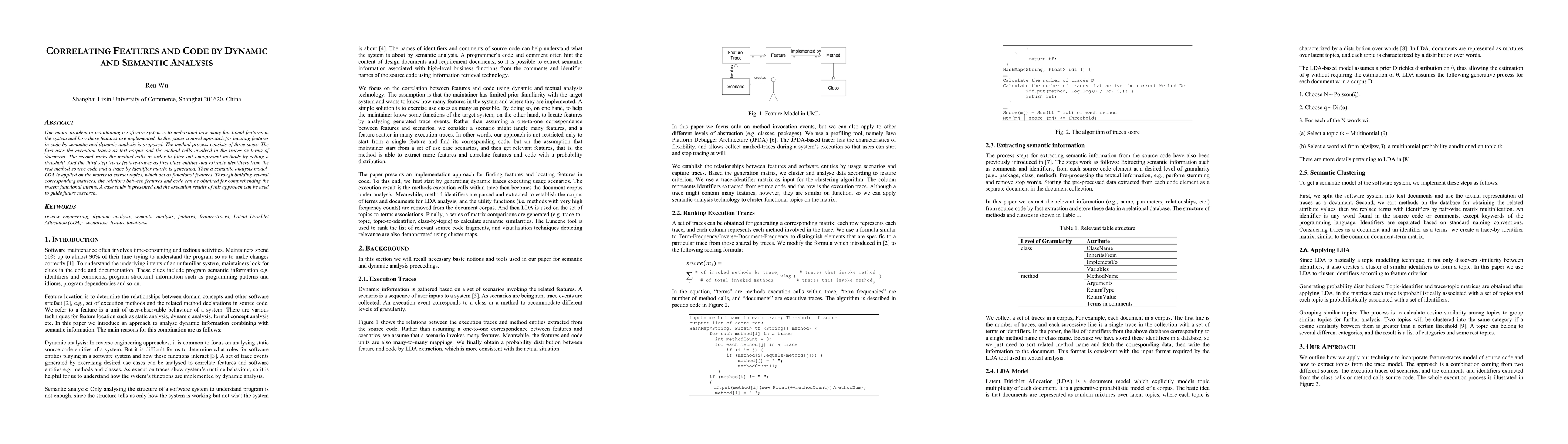 One major problem in maintaining a software system is to understand how many functional features in the system and how these features are implemented. In this paper a novel approach for locating features in code by semantic and dynamic analysis is proposed. The method process consists of three steps: The first uses the execution traces as text corpus and the method calls involved in the traces as terms of document. The second ranks the method calls in order to filter out omnipresent methods by setting a threshold. And the third step treats feature-traces as first class entities and extracts identifiers from the rest method source code and a trace-by-identifier matrix is generated. Then a semantic analysis model-LDA is applied on the matrix to extract topics, which act as functional features. Through building several corresponding matrices, the relations between features and code can be obtained for comprehending the system functional intents. A case study is presented and the execution results of this approach can be used to guide future research.