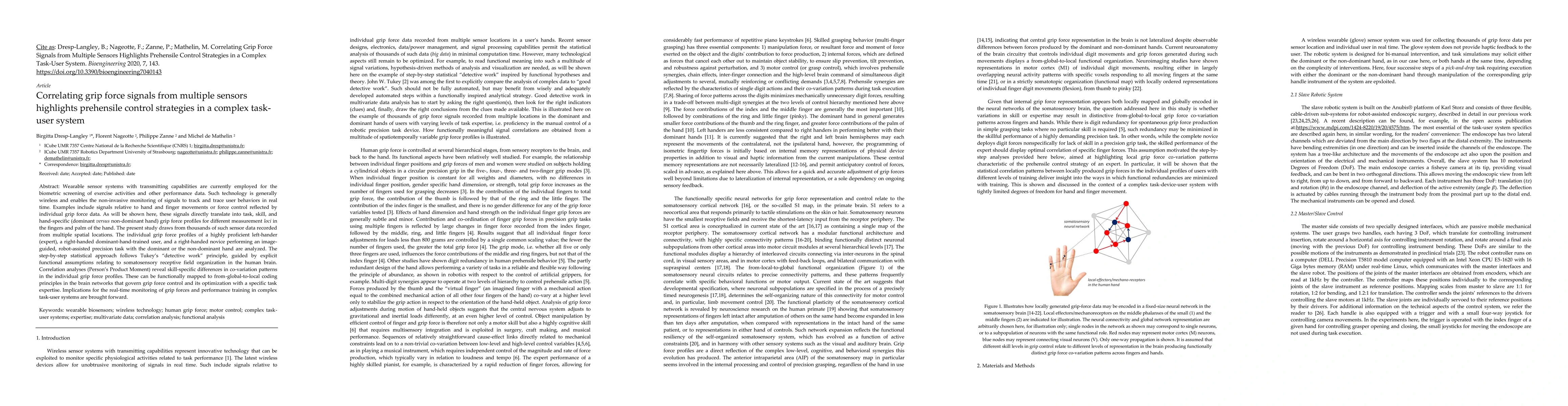 Wearable sensor systems with transmitting capabilities are currently employed for the biometric screening of exercise activities and other performance data. Such technology is generally wireless and enables the noninvasive monitoring of signals to track and trace user behaviors in real time. Examples include signals relative to hand and finger movements or force control reflected by individual grip force data. As will be shown here, these signals directly translate into task, skill, and hand specific, dominant versus non dominant hand, grip force profiles for different measurement loci in the fingers and palm of the hand. The present study draws from thousands of such sensor data recorded from multiple spatial locations. The individual grip force profiles of a highly proficient left handed exper, a right handed dominant hand trained user, and a right handed novice performing an image guided, robot assisted precision task with the dominant or the non dominant hand are analyzed. The step by step statistical approach follows Tukeys detective work principle, guided by explicit functional assumptions relating to somatosensory receptive field organization in the human brain. Correlation analyses in terms of Person Product Moments reveal skill specific differences in covariation patterns in the individual grip force profiles. These can be functionally mapped to from global to local coding principles in the brain networks that govern grip force control and its optimization with a specific task expertise. Implications for the real time monitoring of grip forces and performance training in complex task user systems are brought forward.