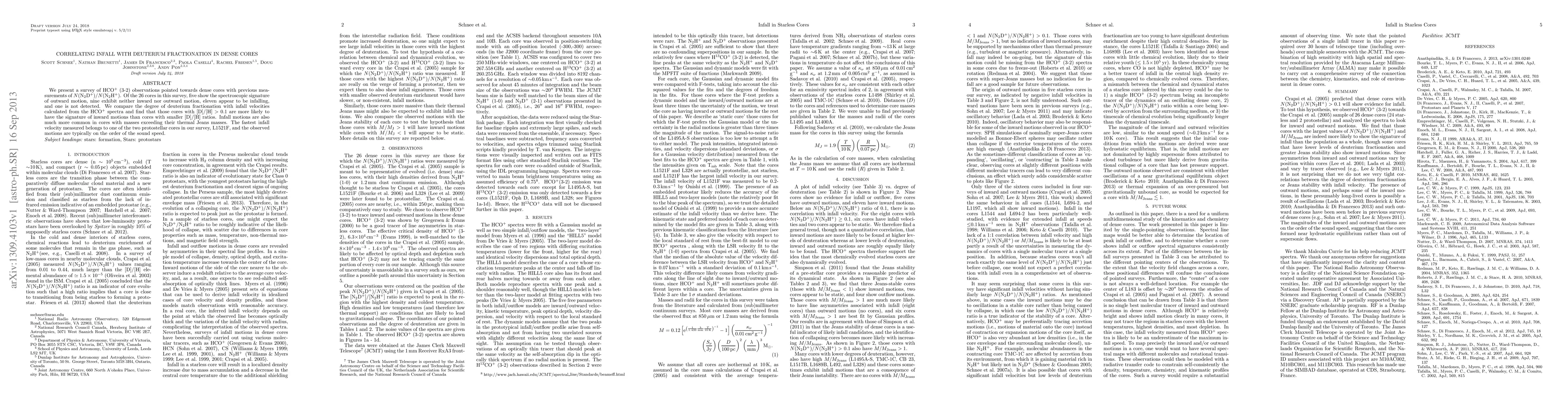 This study observes dense cores using HCO+ (3-2) and finds a correlation between high deuterium fractionation ([D]/[H] > 0.1) and infall motions, more common in massive cores. The fastest infall is seen in the protostellar core L1521F, with typical motions near sound speed.