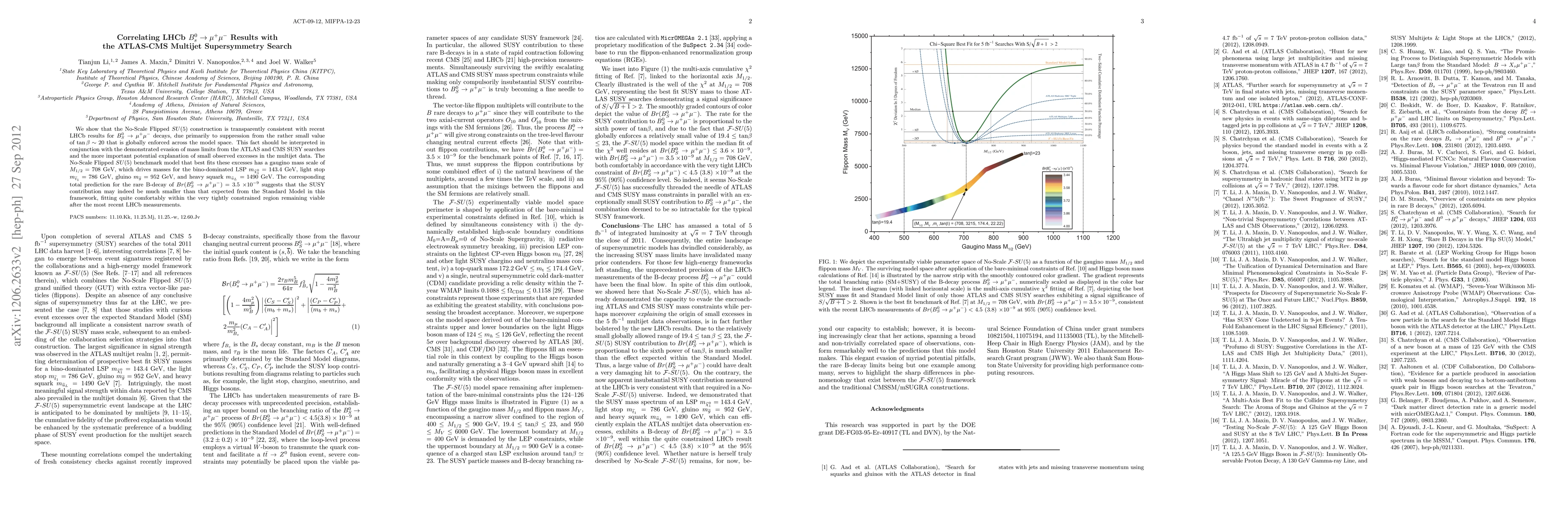 We show that the No-Scale Flipped SU(5) construction is transparently consistent with recent LHCb results for B_s^0 to \mu^+ \mu^- decays, due primarily to suppression from the rather small value of tan\beta ~ 20 that is globally enforced across the model space. This fact should be interpreted in conjunction with the demonstrated evasion of mass limits from the ATLAS and CMS SUSY searches and the more important potential explanation of small observed excesses in the multijet data. The No-Scale Flipped SU(5) benchmark model that best fits these excesses has a gaugino mass scale of M_{1/2} = 708 GeV, which drives masses for the bino-dominated LSP m_\chi_1^0 = 143.4 GeV, light stop m_t1 = 786 GeV, gluino m_g = 952 GeV, and heavy squark m_uL = 1490 GeV. The corresponding total prediction for the rare B-decay of Br(B_s^0 to \mu^+ \mu^-) = 3.5 x 10^-9 suggests that the SUSY contribution may indeed be much smaller than that expected from the Standard Model in this framework, fitting quite comfortably within the very tightly constrained region remaining viable after the most recent LHCb measurements.