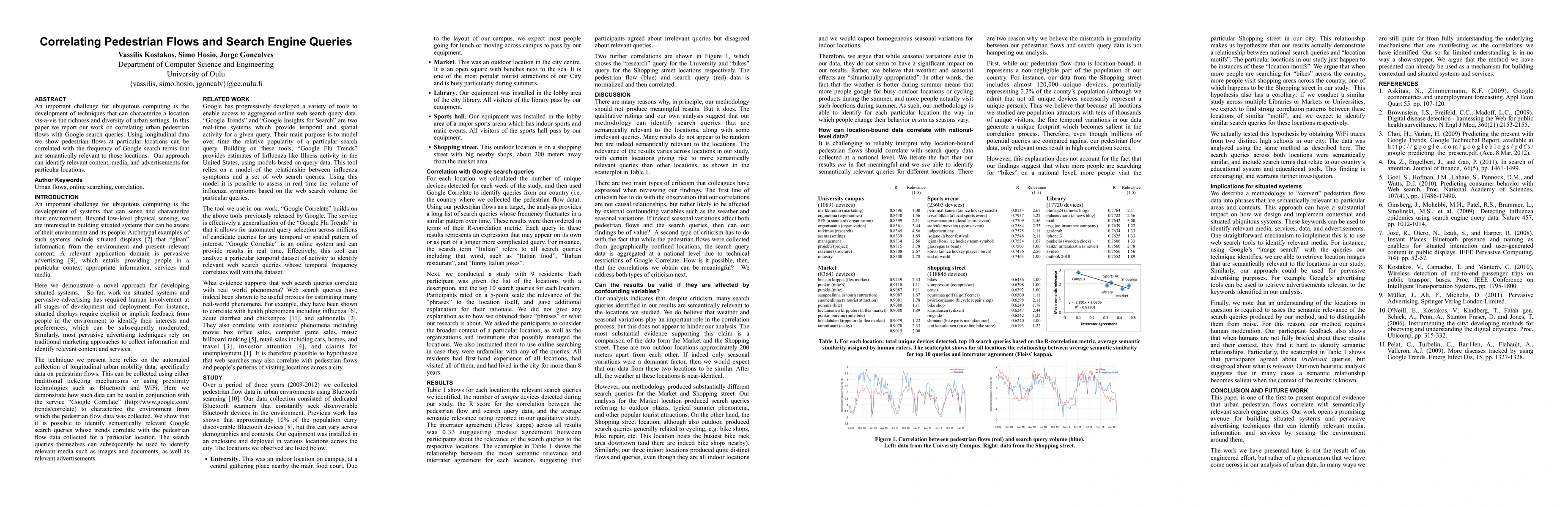 Researchers correlated urban pedestrian flows with Google search queries to identify relevant content for specific locations. They found that pedestrian flow at certain spots can predict the frequency of semantically relevant search terms.