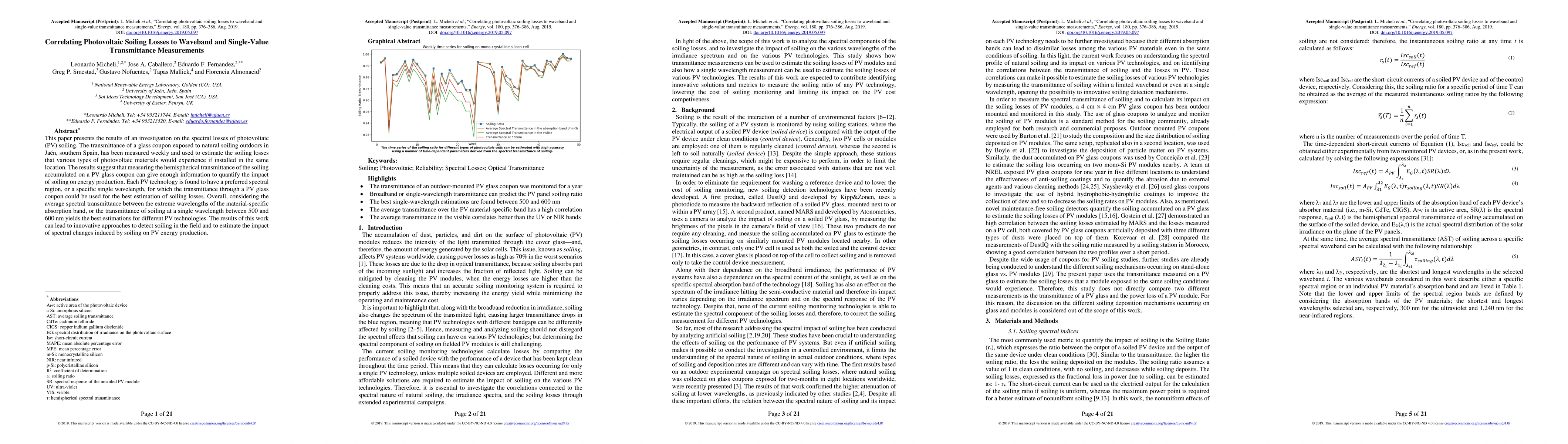 This study investigates the spectral losses due to photovoltaic (PV) soiling, finding that average spectral transmittance or single-wavelength measurements at 500-600 nm can best estimate soiling impacts on PV energy production. Each PV technology has a preferred spectral region for optimal soiling loss estimation.