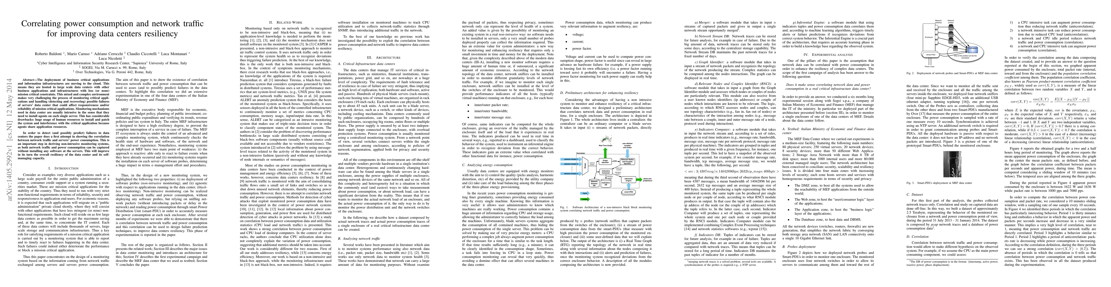 The deployment of business critical applications and information infrastructures are moving to the cloud. This means they are hosted in large scale data centers with other business applications and infrastructures with less (or none) mission critical constraints. This mixed and complex environment makes very challenging the process of monitoring critical applications and handling (detecting and recovering) possible failures of servers' data center that could affect responsiveness and/or reliability of mission critical applications. Monitoring mechanisms used in data center are usually intrusive in the sense that they need to install agents on each single server. This has considerable drawbacks: huge usage of human resources to install and patch the system and interference with the critical application because agents share application resources. In order to detect (and possibly predict) failures in data centers the paper does a first attempt in showing the correlation between network traffic and servers' power consumption. This is an important step in deriving non-intrusive monitoring systems, as both network traffic and power consumption can be captured without installing any software at the servers. This will improve in its turn the overall resiliency of the data center and its self-managing capacity.