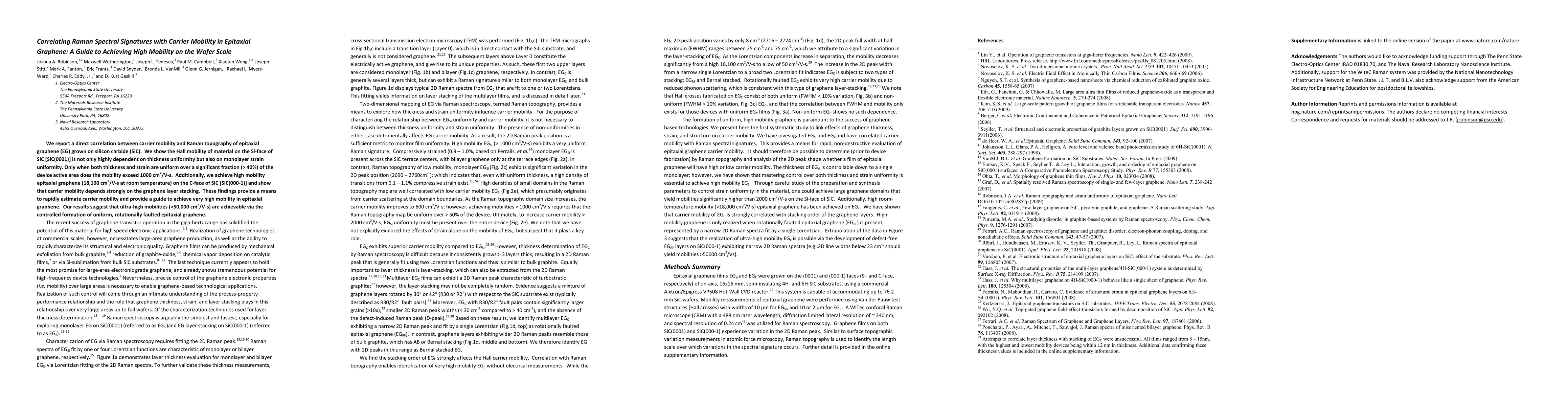 This paper correlates Raman spectral signatures with carrier mobility in epitaxial graphene on SiC substrates, revealing that high mobility (>1000 cm²/V-s) is achieved when both thickness and strain uniformity exceed 40%. It also reports high mobility (18,100 cm²/V-s) on the C-face of SiC and suggests potential for ultra-high mobility (>50,000 cm²/V-s) through controlled graphene layer formation.