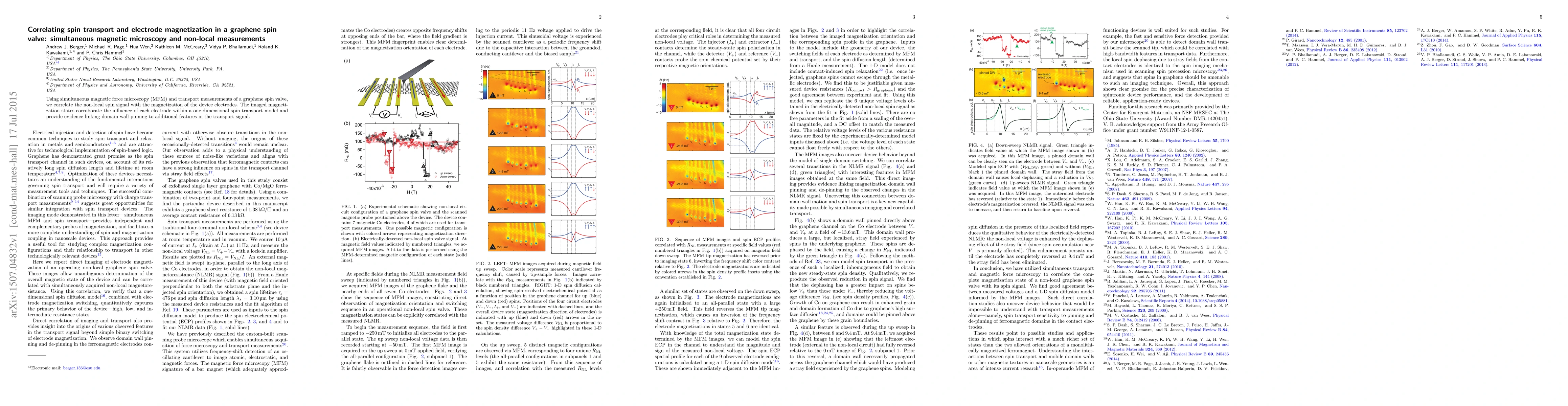 Using simultaneous magnetic force microscopy (MFM) and transport measurements of a graphene spin valve, we correlate the non-local spin signal with the magnetization of the device electrodes. The imaged magnetization states corroborate the influence of each electrode within a one-dimensional spin transport model and provide evidence linking domain wall pinning to additional features in the transport signal.