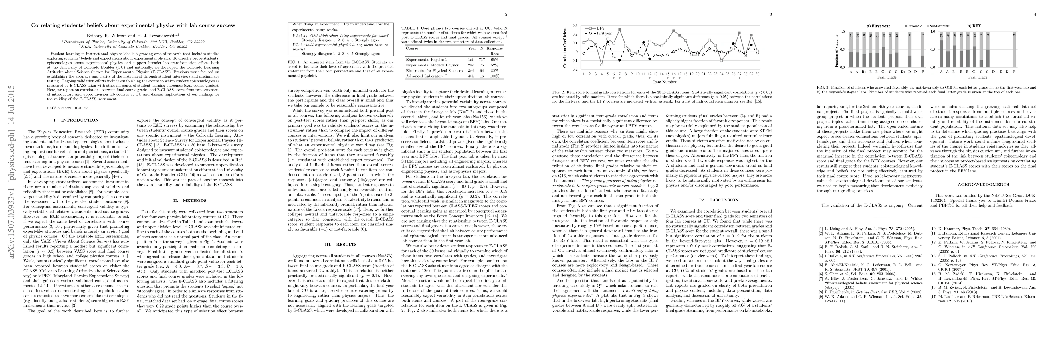 This paper investigates the correlation between students' beliefs about experimental physics, measured by the E-CLASS survey, and their success in lab courses at CU Boulder. The study finds a significant relationship between E-CLASS scores and final course grades, supporting the instrument's validity for assessing student epistemologies in physics labs.