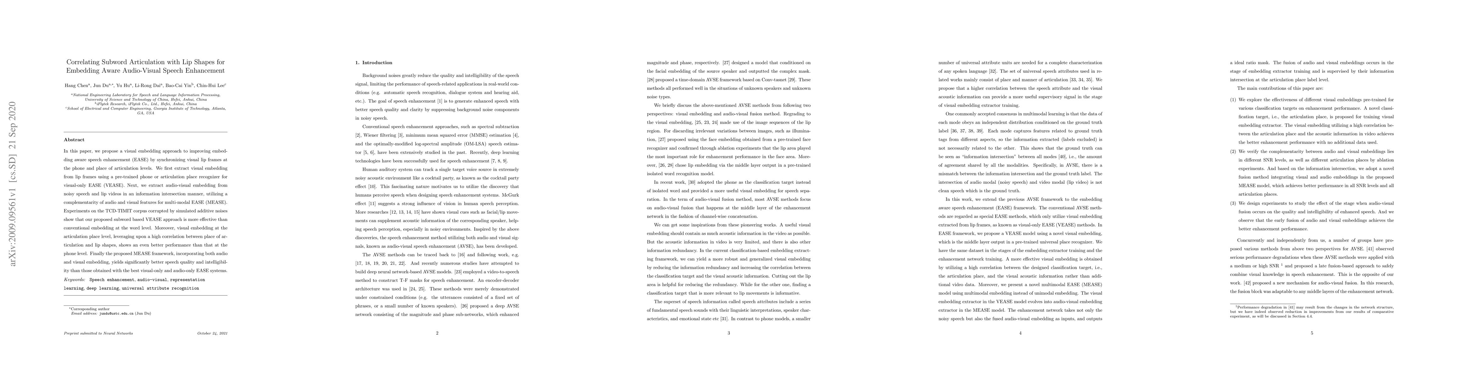 This paper proposes a visual embedding approach to enhance embedding aware speech enhancement (EASE) by aligning visual lip frames with phone and articulation place levels. The method achieves better results than conventional word-level embedding, especially when using articulation place-level visual embedding, and shows significant improvements in speech quality and intelligibility through a multi-modal EASE framework combining audio and visual features.