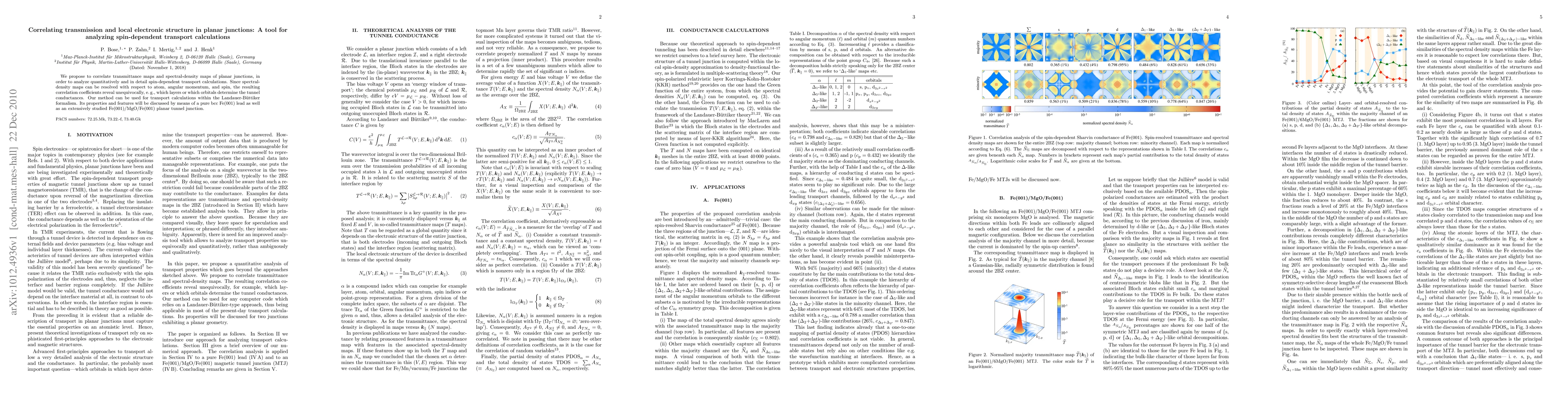 We propose to correlate transmittance maps and spectral-density maps of planar junctions, in order to analyze quantitatively and in detail spin-dependent transport calculations. Since spectral-density maps can be resolved with respect to atom, angular momentum, and spin, the resulting correlation coefficients reveal unequivocally, e.g., which layers or which orbitals determine the tunnel conductances. Our method can be used for transport calculations within the Landauer-B\"uttiker formalism. Its properties and features will be discussed by means of a pure bcc Fe(001) lead as well as an extensively studied Fe(001)/MgO/Fe(001) planar tunnel junction.
