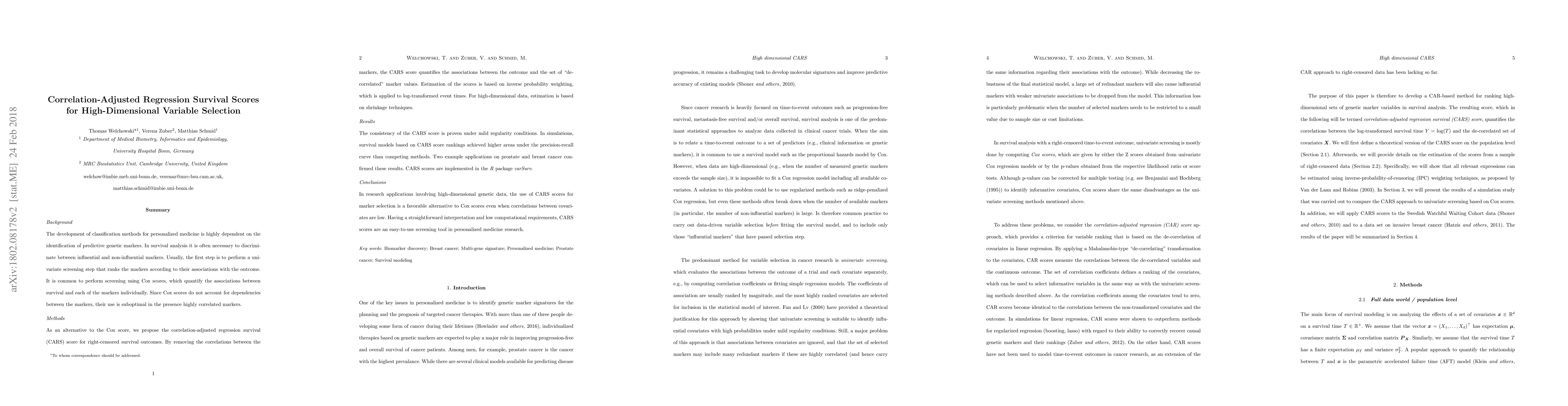 The paper proposes the correlation-adjusted regression survival (CARS) score to identify predictive genetic markers in high-dimensional data, offering a superior alternative to Cox scores by accounting for marker correlations. CARS scores, implemented in the R package carSurv, demonstrated better performance in simulations and real-world applications for prostate and breast cancer.