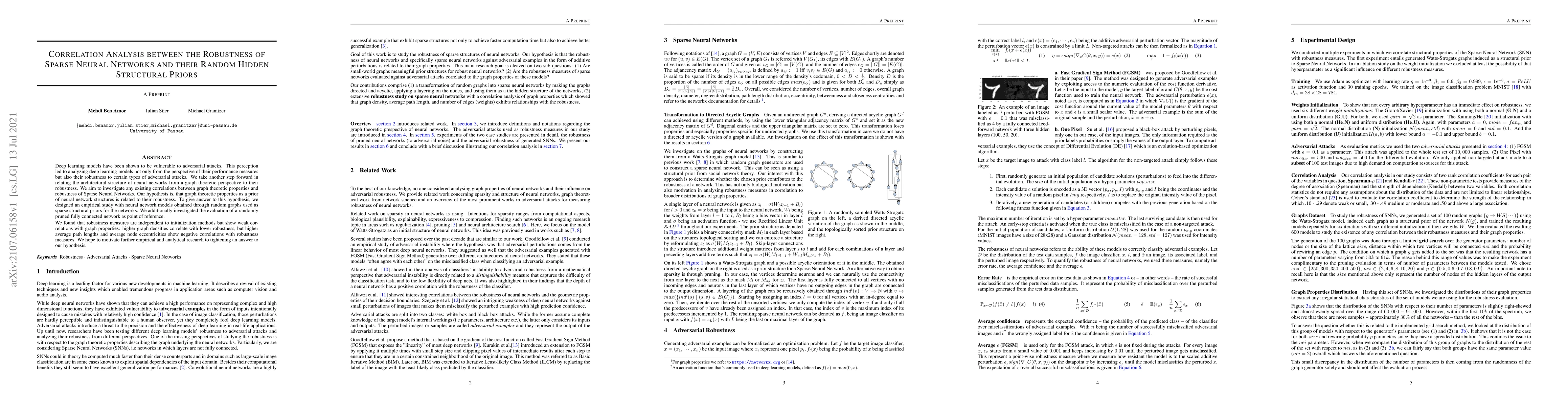 A study investigates correlations between sparse neural network robustness and their graph-theoretic properties, finding weak correlations with density, path length, and node eccentricity.