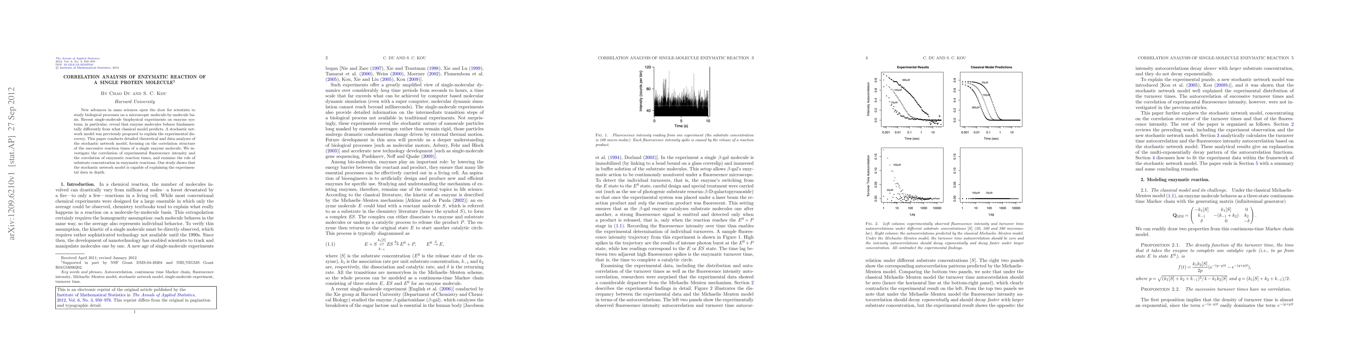 New advances in nano sciences open the door for scientists to study biological processes on a microscopic molecule-by-molecule basis. Recent single-molecule biophysical experiments on enzyme systems, in particular, reveal that enzyme molecules behave fundamentally differently from what classical model predicts. A stochastic network model was previously proposed to explain the experimental discovery. This paper conducts detailed theoretical and data analyses of the stochastic network model, focusing on the correlation structure of the successive reaction times of a single enzyme molecule. We investigate the correlation of experimental fluorescence intensity and the correlation of enzymatic reaction times, and examine the role of substrate concentration in enzymatic reactions. Our study shows that the stochastic network model is capable of explaining the experimental data in depth.