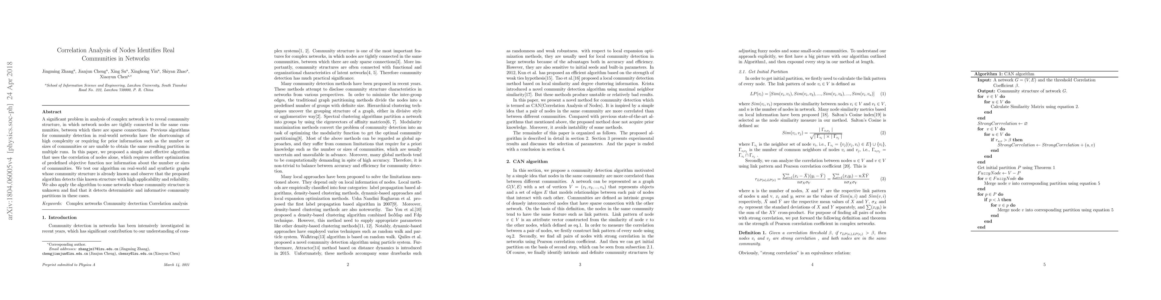 A significant problem in analysis of complex network is to reveal community structure, in which network nodes are tightly connected in the same communities, between which there are sparse connections. Previous algorithms for community detection in real-world networks have the shortcomings of high complexity or requiring for prior information such as the number or sizes of communities or are unable to obtain the same resulting partition in multiple runs. In this paper, we proposed a simple and effective algorithm that uses the correlation of nodes alone, which requires neither optimization of predefined objective function nor information about the number or sizes of communities. We test our algorithm on real-world and synthetic graphs whose community structure is already known and observe that the proposed algorithm detects this known structure with high applicability and reliability. We also apply the algorithm to some networks whose community structure is unknown and find that it detects deterministic and informative community partitions in these cases.