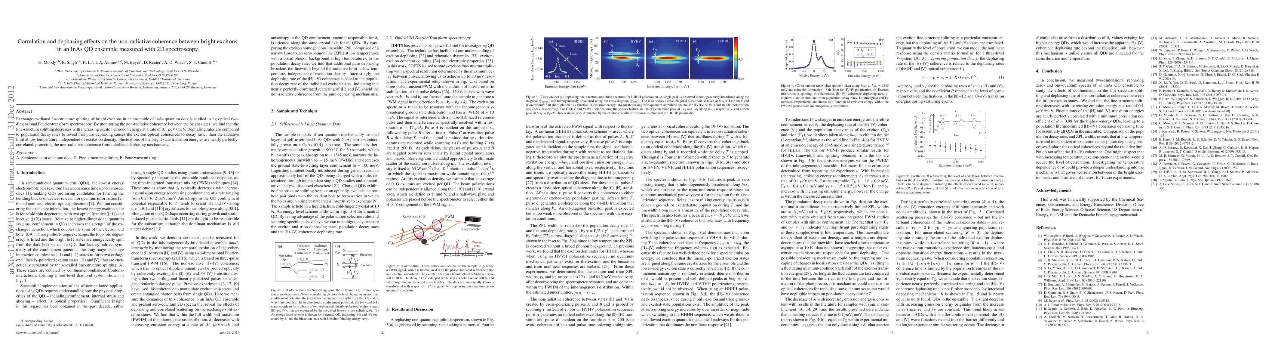Exchange-mediated fine-structure splitting of bright excitons in an ensemble of InAs quantum dots is studied using optical two-dimensional Fourier-transform spectroscopy. By monitoring the non-radiative coherence between the bright states, we find that the fine-structure splitting decreases with increasing exciton emission energy at a rate of 0.1 $\mu$eV/meV. Dephasing rates are compared to population decay rates to reveal that pure dephasing causes the exciton optical coherences to decay faster than the radiative limit at low temperature, independent of excitation density. Fluctuations of the bright state transition energies are nearly perfectly-correlated, protecting the non-radiative coherence from interband dephasing mechanisms.