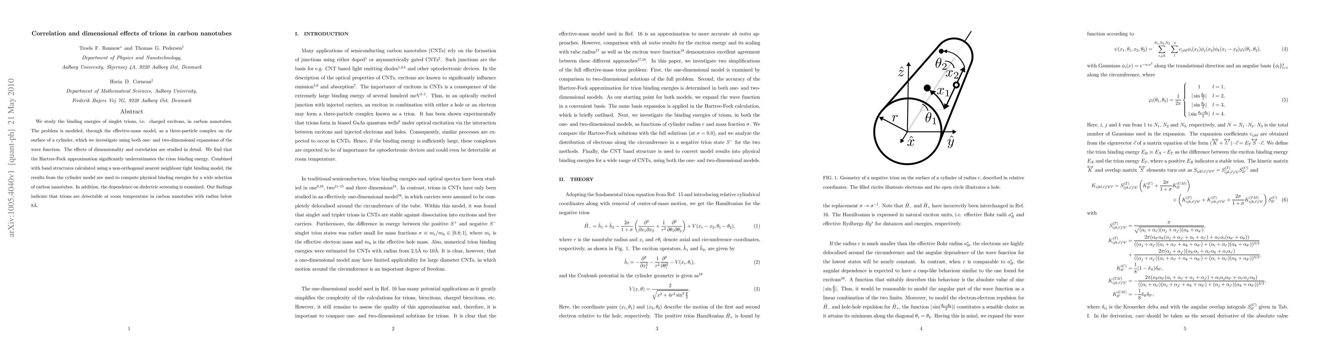 This study examines the binding energies of singlet trions in carbon nanotubes, revealing that the Hartree-Fock approximation underestimates these energies. The research combines effective-mass models with 1D and 2D expansions to explore dimensionality and correlation effects, predicting trions can be detected at room temperature in carbon nanotubes with radii under 8 Å.