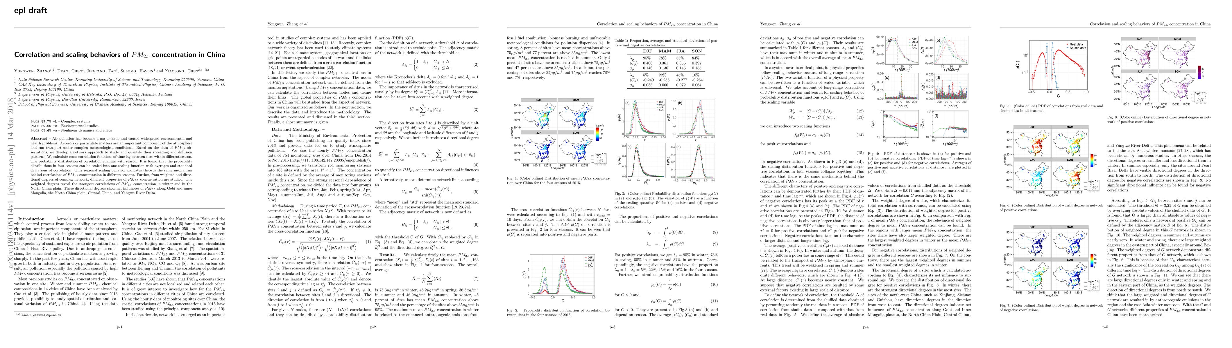 Air pollution has become a major issue and caused widespread environmental and health problems. Aerosols or particulate matters are an important component of the atmosphere and can transport under complex meteorological conditions. Based on the data of $PM_{2.5}$ observations, we develop a network approach to study and quantify their spreading and diffusion patterns. We calculate cross-correlation functions of time lag between sites within different season. The probability distribution of correlation changes with season. It is found that the probability distributions in four seasons can be scaled into one scaling function with averages and standard deviations of correlation. This seasonal scaling behavior indicates there is the same mechanism behind correlations of $PM_{2.5}$ concentration in different seasons. Further, from weighted and directional degrees of complex network, different properties of $PM_{2.5}$ concentration are studied. The weighted degrees reveal the strongest correlations of $PM_{2.5}$ concentration in winter and in the North China plain. These directional degrees show net influences of $PM_{2.5}$ along Gobi and inner Mongolia, the North China plain, Central China, and Yangtze River Delta.