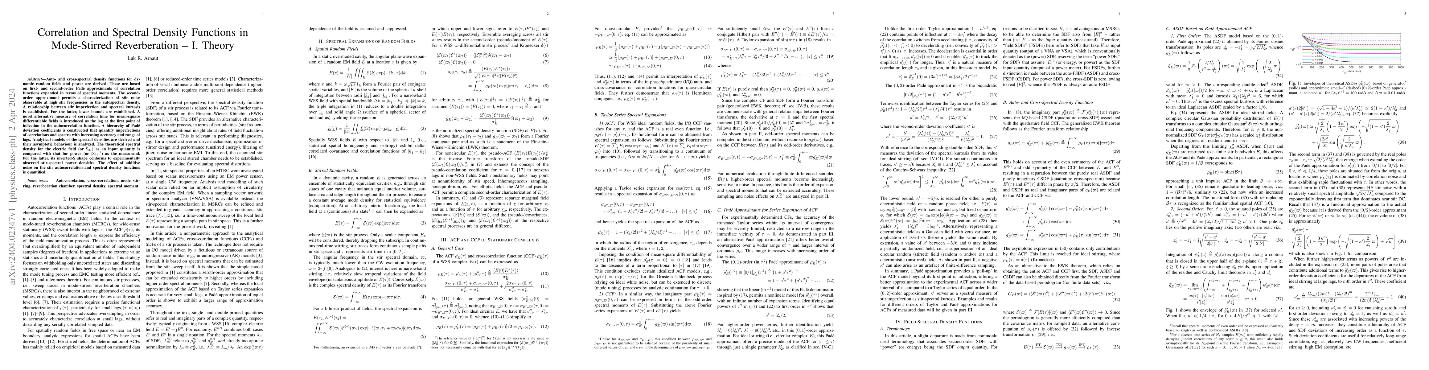 This paper develops theoretical models for auto- and cross-spectral density functions in mode-stirred reverberation, using first- and second-order Padé approximants. It introduces a new measure for correlation time and examines the impact of additive noise, showing that the spectral density for power aligns with observed stir-spectral densities.
